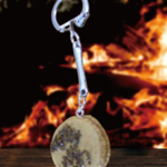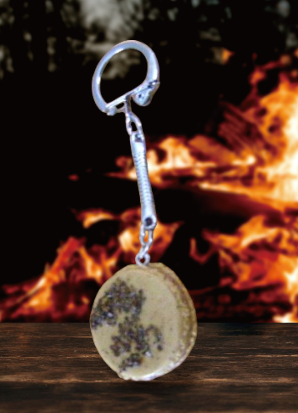 Création réalisée dans mon atelier, ce porte-clés représente un macaron au café orné d’éclats, confectionné en fimo.