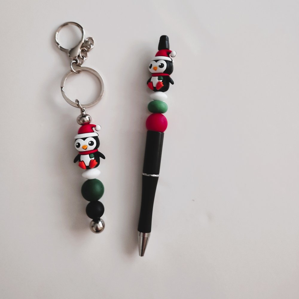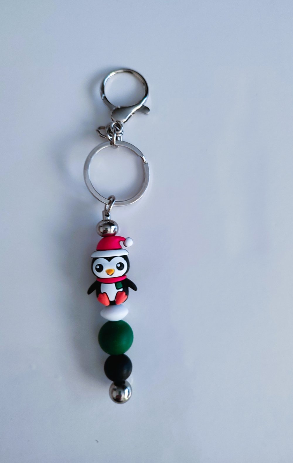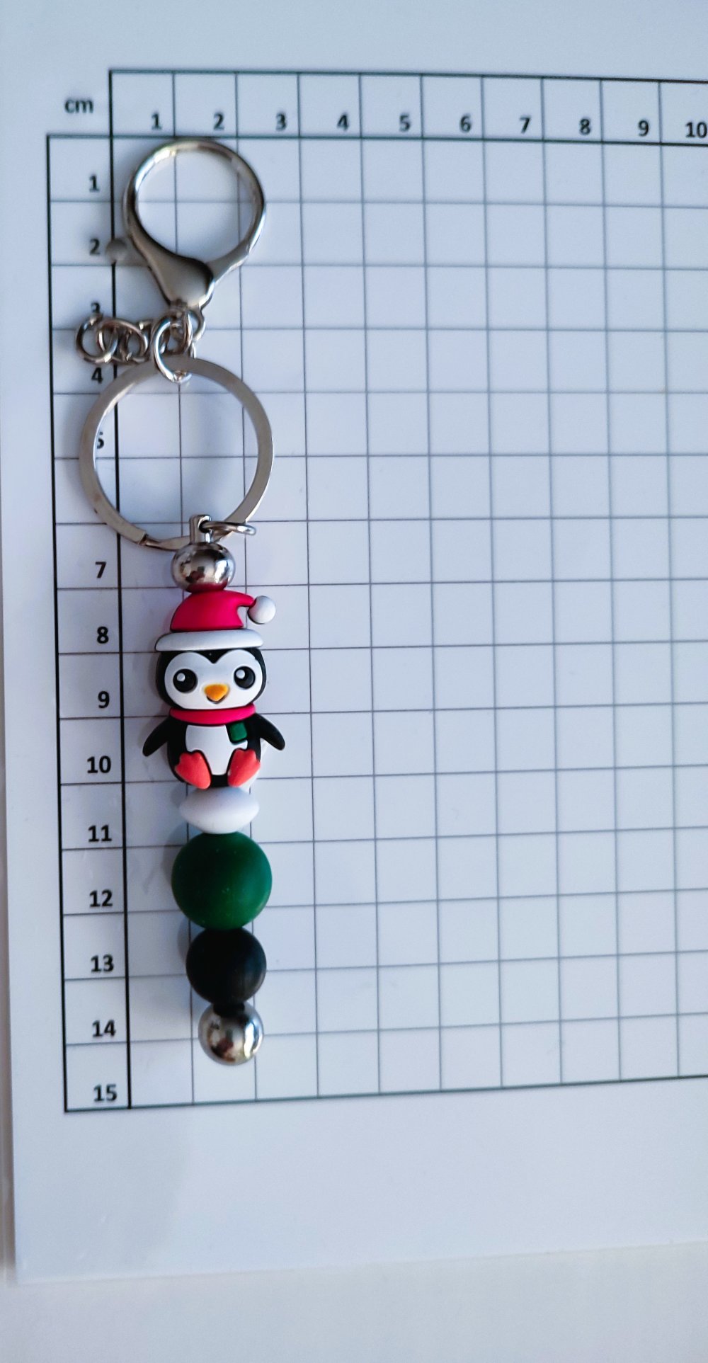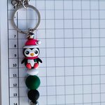 Porte clés pingouin et perles en silicone blanche verte et noir
