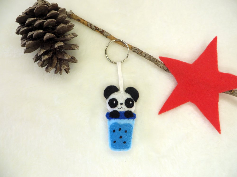 Adorable porte-clés panda kawaii en feutrine, fait main, caché dans un verre de bubble tea bleu. Un accessoire unique et original, parfait pour ajouter une touche mignonne à vos sacs ou offrir en cadeau.