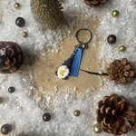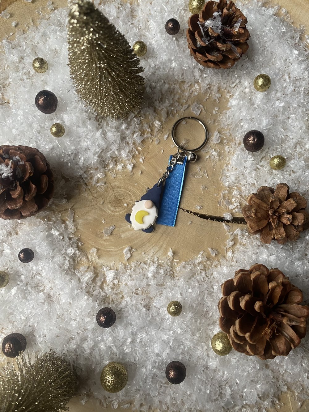 Porte-clés décoré de rubans en satin bleus et organza dorés, d'un grelot argenté et d'un gnome réalisé en pate polymère