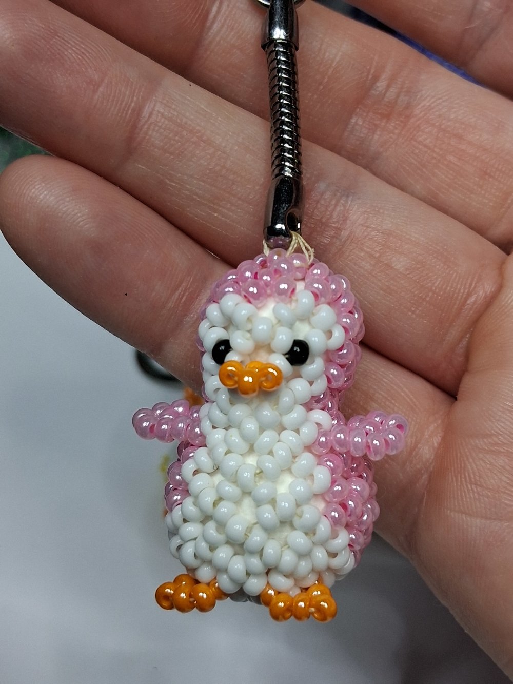 Petit porte-clés pingouin rose réalisé en perles de rocaille.