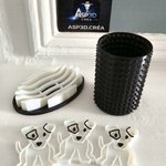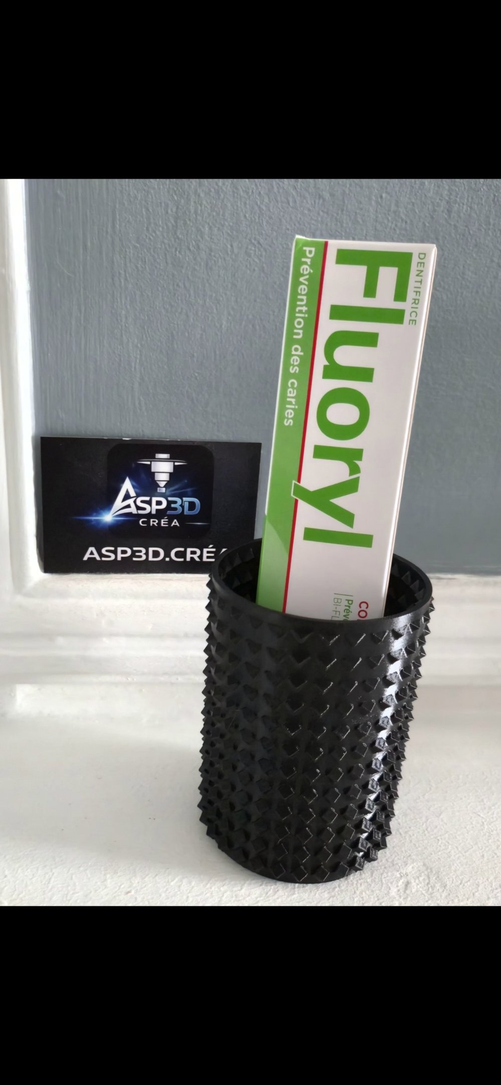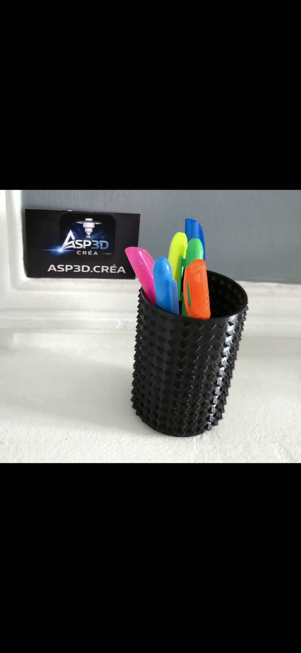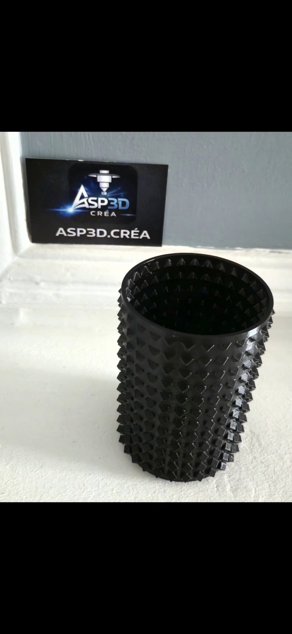 Découvrez l'accessoire polyvalent par excellence de ASP3D CRÉA. Avec sa texture unique à picots pyramidaux, ce pot s'adapte à tous vos besoins : gobelet à brosses à dents grâce à son traitement d’imperméabilisation complet, ou pot à crayons stylisé pour votre bureau. Sa finition noire mate et son relief audacieux en font un objet de décoration à la fois moderne et tactile.