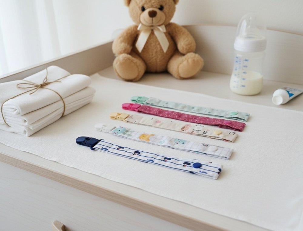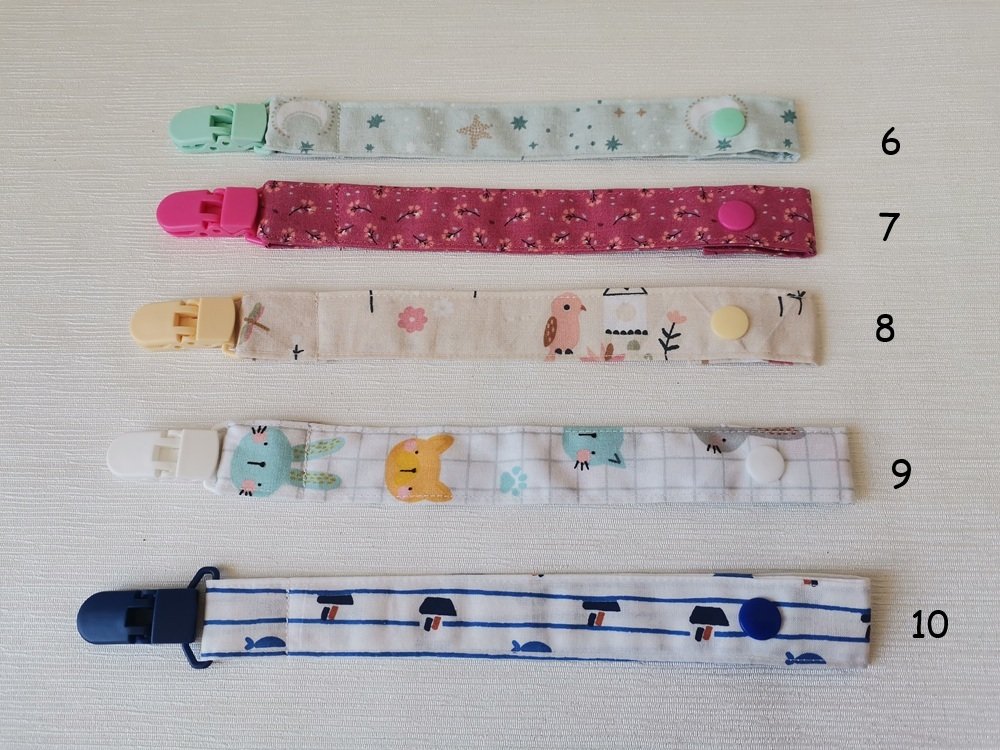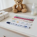 Attache tétine en tissus coton certifié Oeko-Tex imprimé avec pince couleur et bouton pression