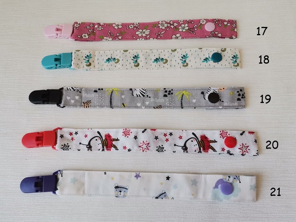 Attache tétine en tissus coton certifié Oeko-Tex imprimé avec pince couleur et bouton pression