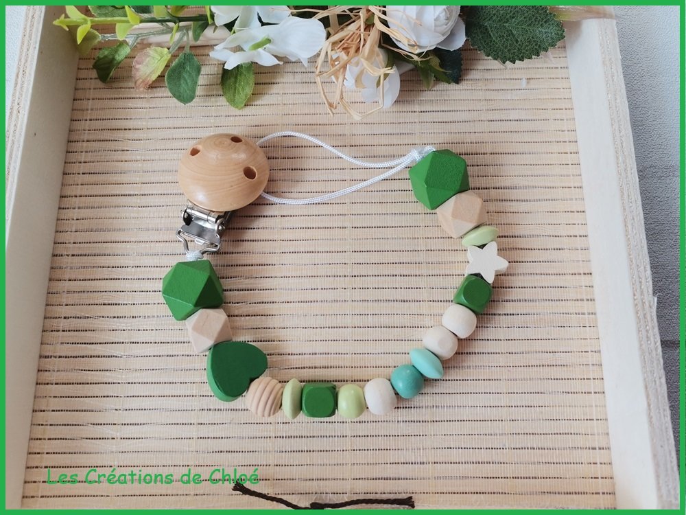 Cette attache tétine est fabriquée avec des perles en bois de différentes tailles, formes et couleurs