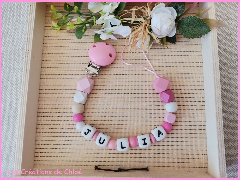 Cette attache tétine personnalisée est fabriquée avec des perles en bois de différentes tailles, formes et couleurs, et des perles alphabet en silicone.
