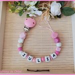 Longueur environ 24 cm. S'adapte sur les tétines avec anneau. Maximum 9 lettres, uniquement lettres majuscules sans accents.