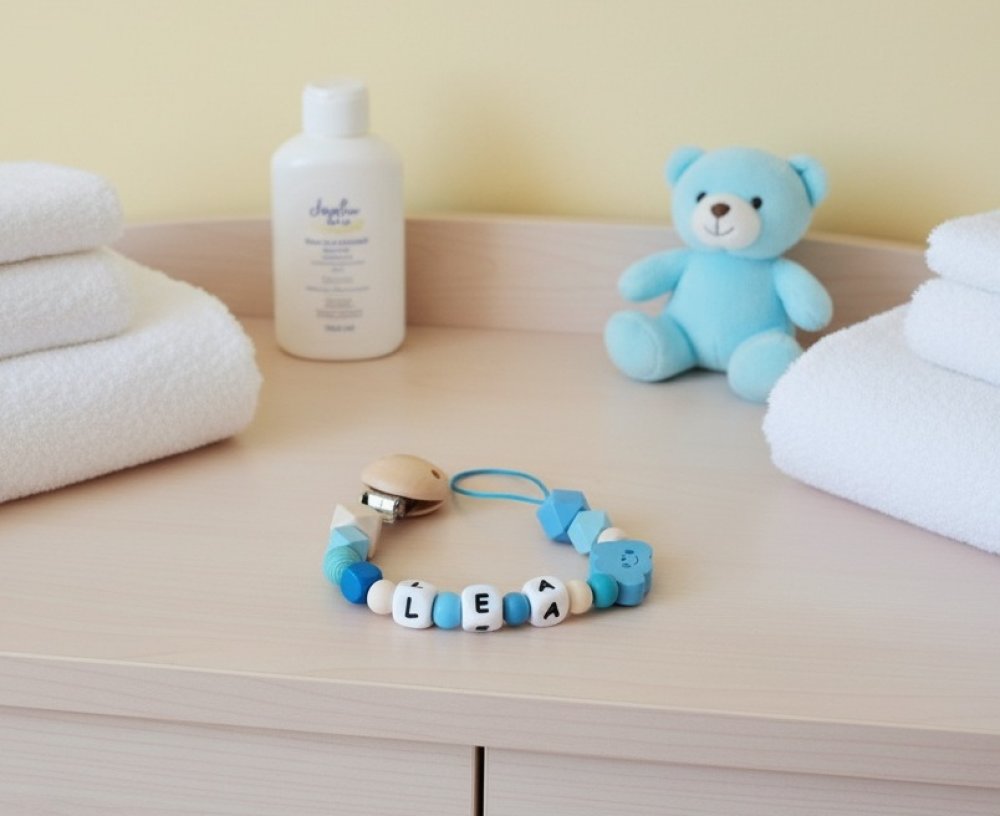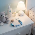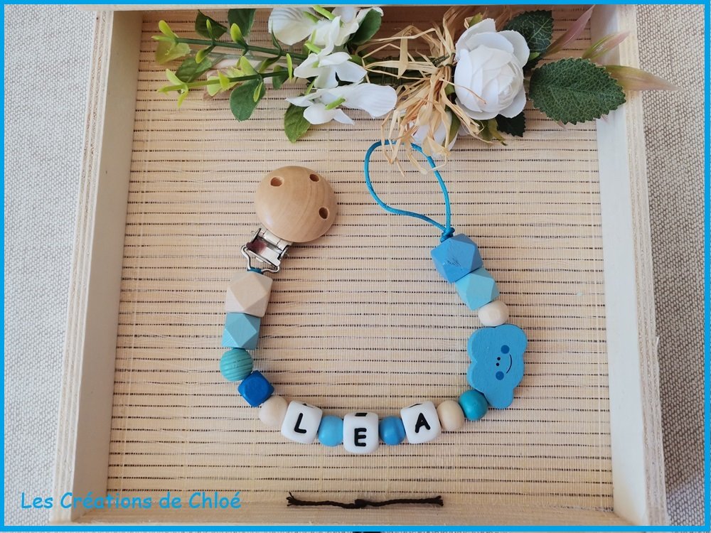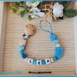 Cette attache tétine personnalisée est fabriquée avec des perles en bois de différentes tailles, formes et couleurs, et des perles alphabet en silicone.