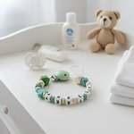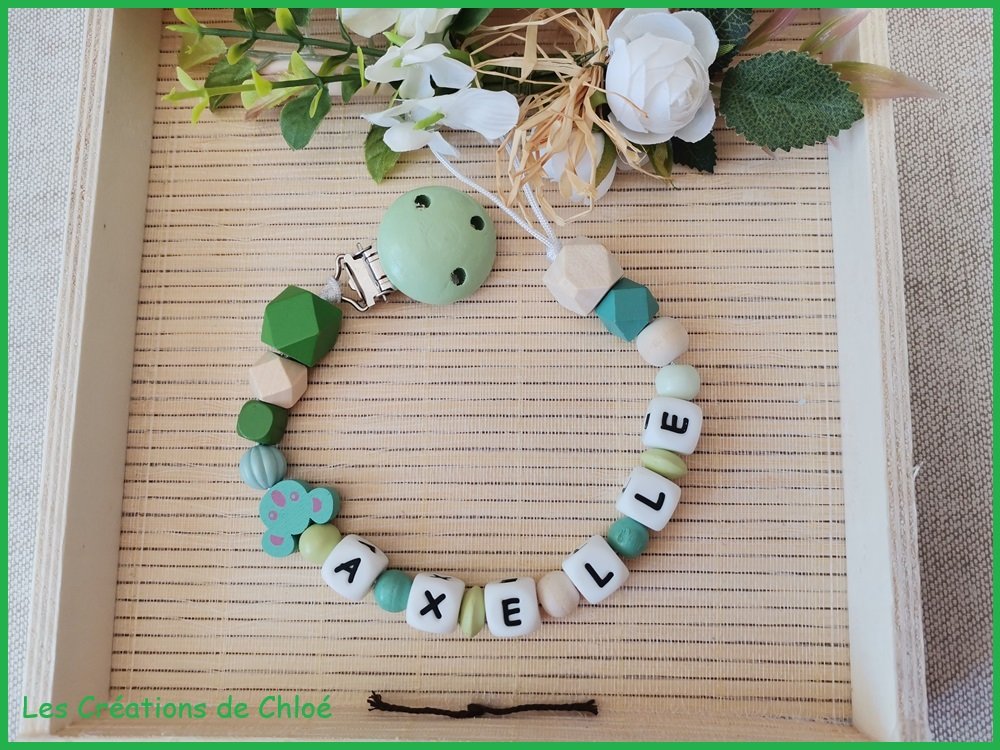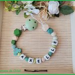 Cette attache tétine personnalisée est fabriquée avec des perles en bois de différentes tailles, formes et couleurs, et des perles alphabet en silicone.