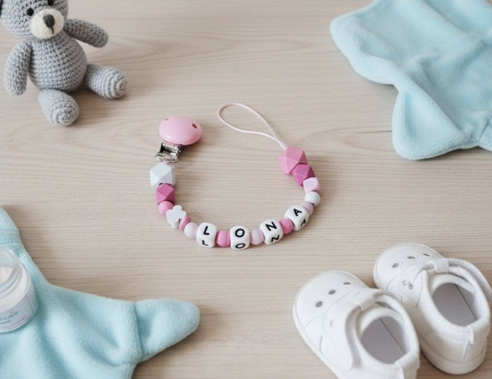 Longueur environ 24 cm. S'adapte sur les tétines avec anneau. Maximum 9 lettres, uniquement lettres majuscules sans accents.
