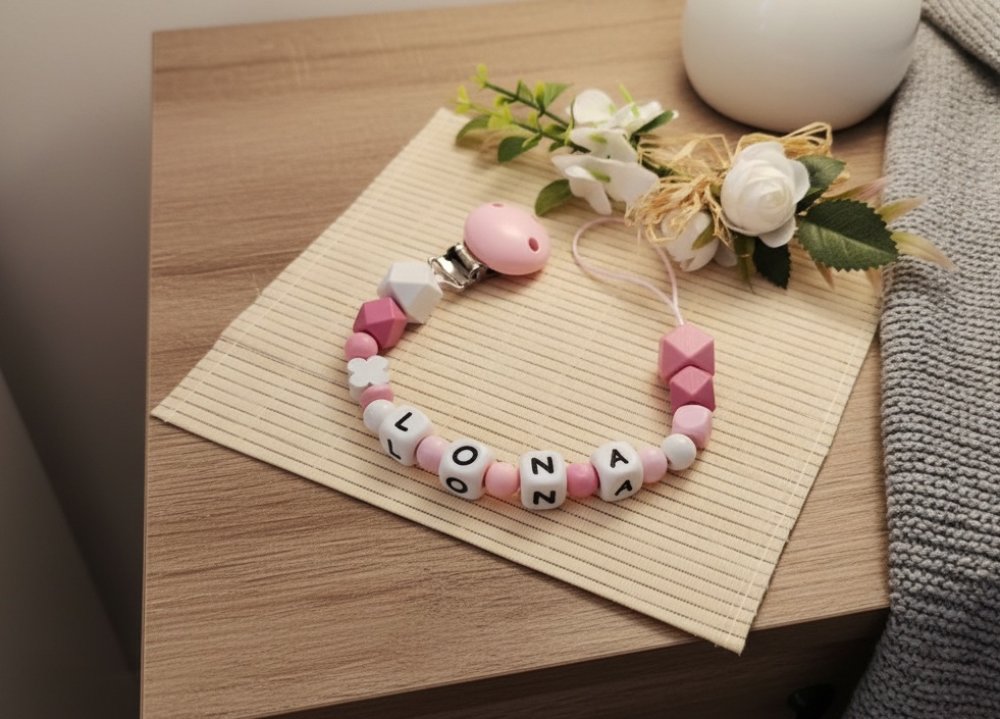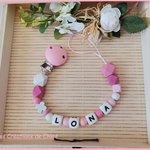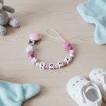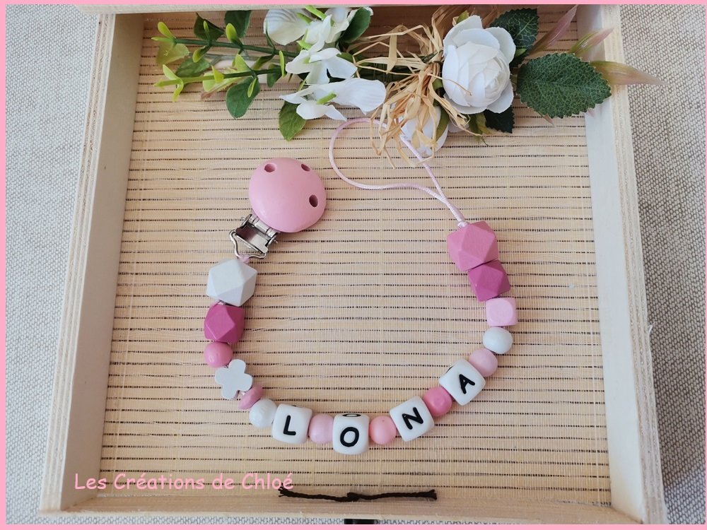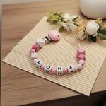 Cette attache tétine personnalisée est fabriquée avec des perles en bois de différentes tailles, formes et couleurs, et des perles alphabet en silicone.