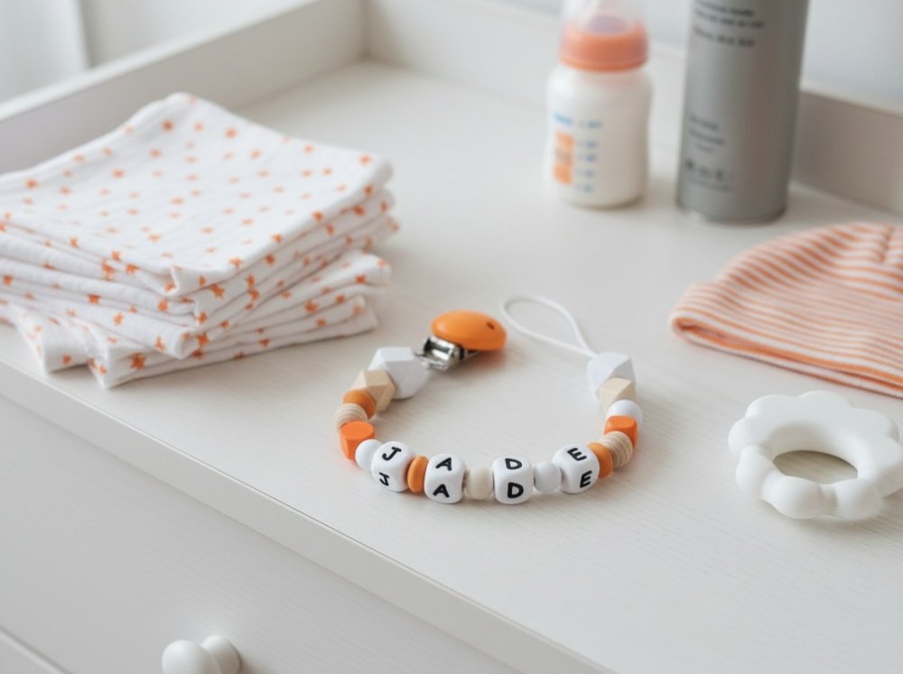 Longueur environ 23 cm. S'adapte sur les tétines avec anneau. Maximum 9 lettres, uniquement lettres majuscules sans accents.