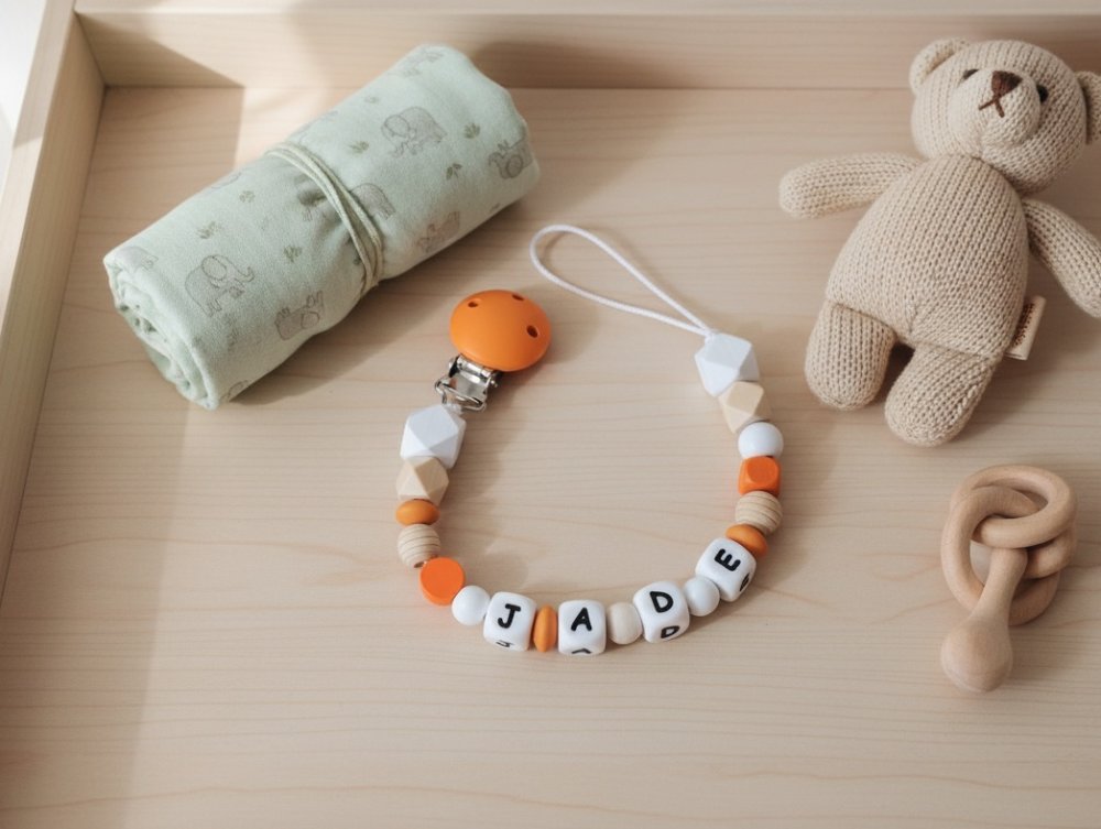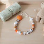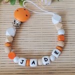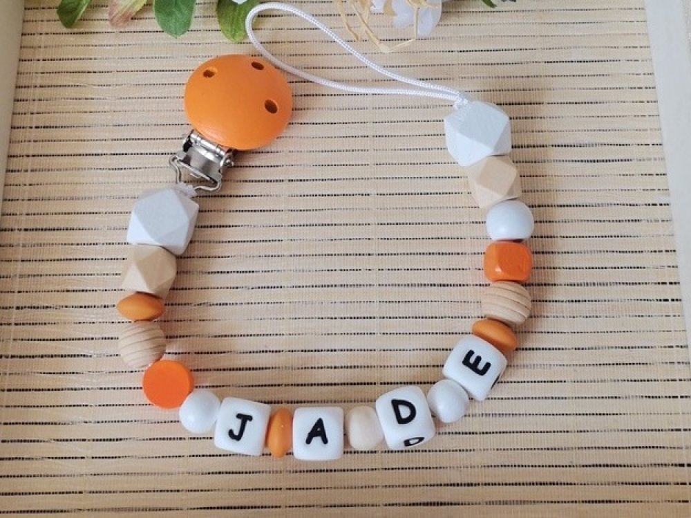 Cette attache tétine personnalisée est fabriquée avec des perles en bois de différentes tailles, formes et couleurs, et des perles alphabet en silicone.