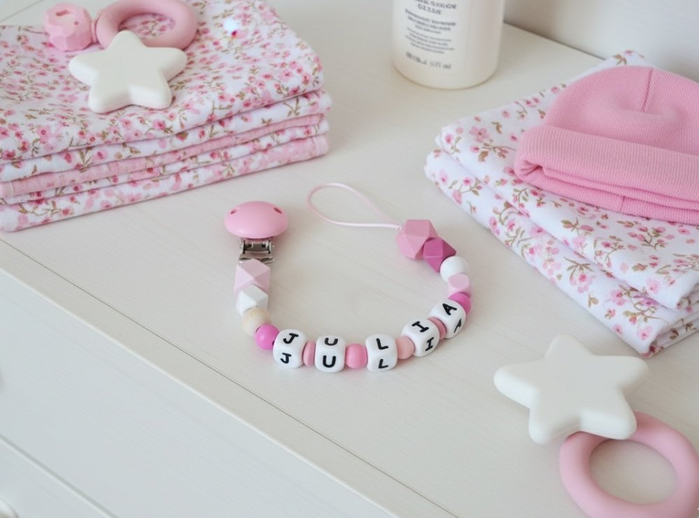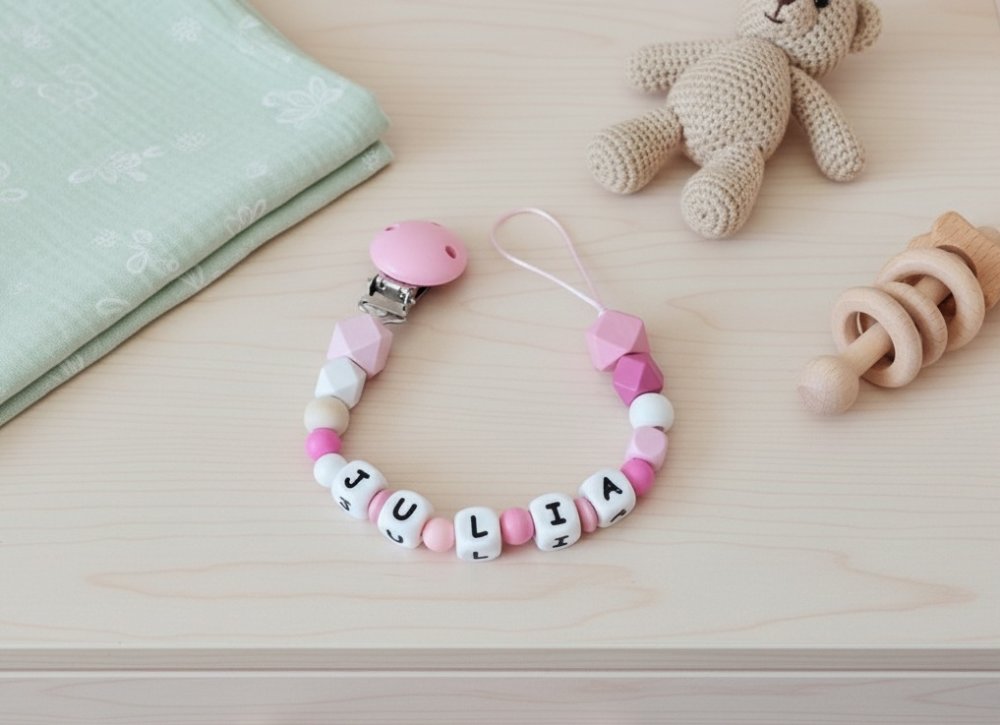 Longueur environ 24 cm. S'adapte sur les tétines avec anneau. Maximum 9 lettres, uniquement lettres majuscules sans accents.