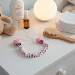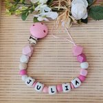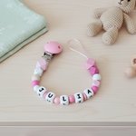Cette attache tétine personnalisée est fabriquée avec des perles en bois de différentes tailles, formes et couleurs, et des perles alphabet en silicone.