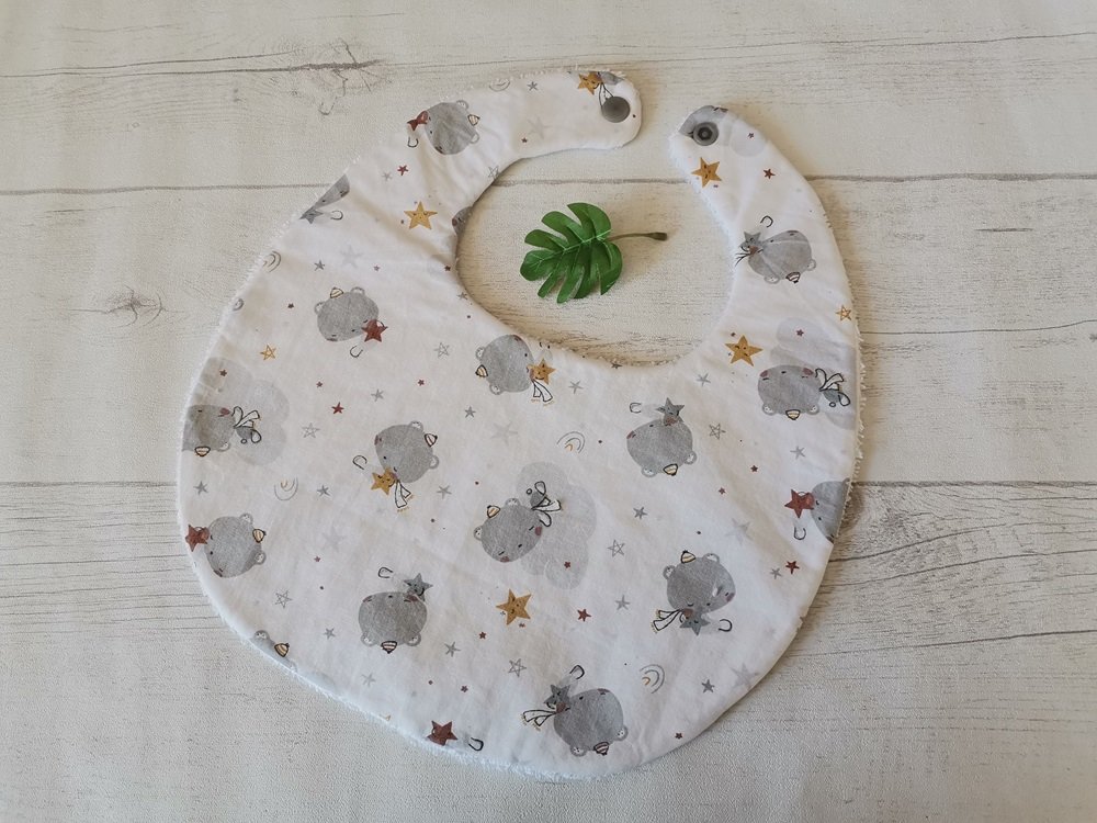 Ce joli petit bavoir se ferme par un bouton pression en résine de couleur grise