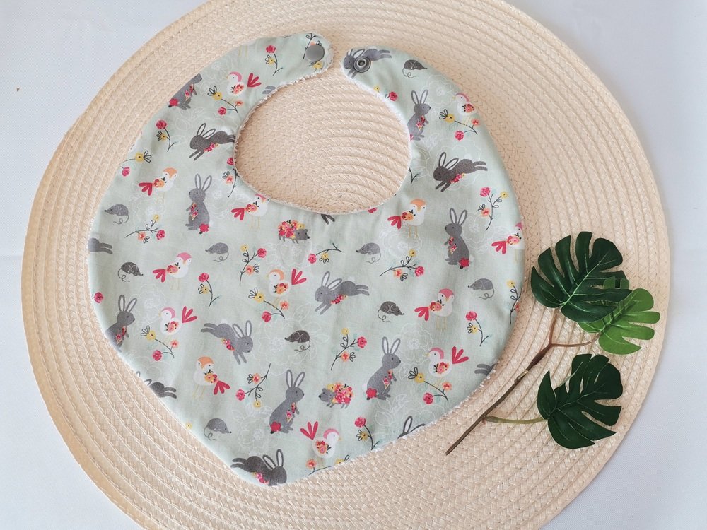 Ce joli petit bavoir se ferme par un bouton pression en résine de couleur grise