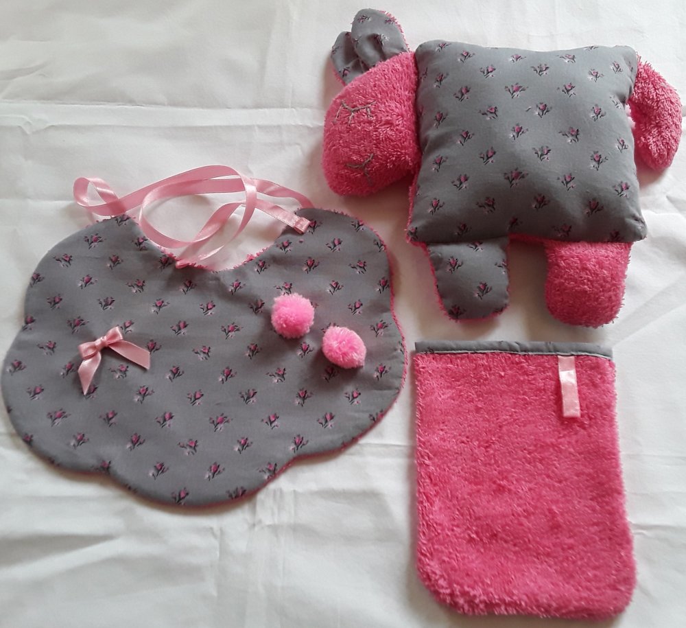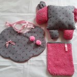 Doudou forme mouton en tissu éponge coloris framboise avec un bavoir en forme de fleur orné d'un petit nœud ainsi que 2 pompons et un petit gant de toilette