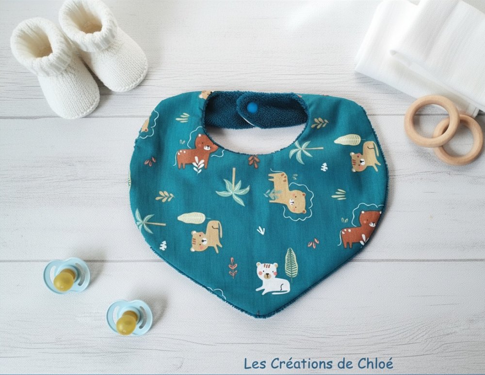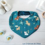 Ce joli petit bavoir se ferme par un bouton pression en résine de couleur turquoise