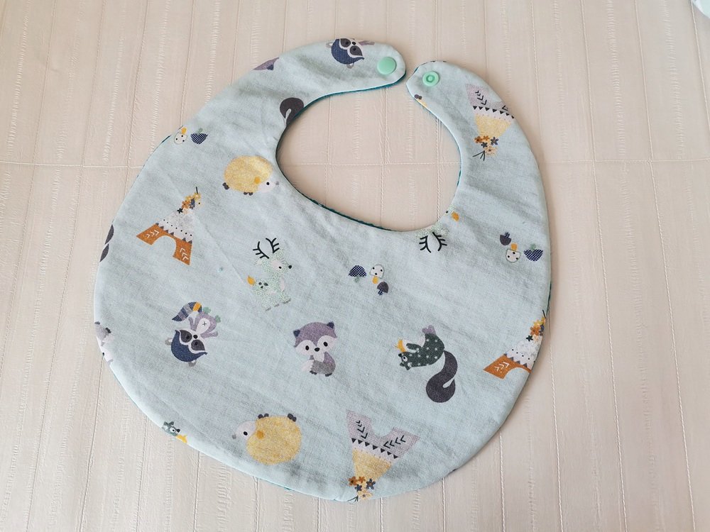 Ce joli petit bavoir se ferme par un bouton pression en résine de couleur vert clair