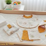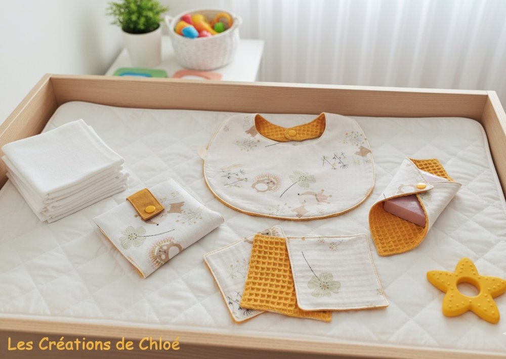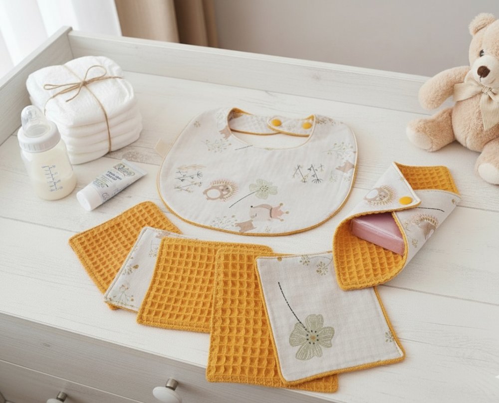 Ensemble naissance composé d'un bavoir tissu coton beige imprimé doublé en tissu nid d'abeilles moutarde et fermé par un bouton pression jaune , 1 pochette à savon doublé en tissus nid d'abeilles et fermée par un bouton pression , 6 lingettes coton et 1 pochette à lingettes refermable grâce à un bouton pression
