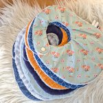 Un semainier de bavoirs orange , un joli bavoir par jour avec de motifs différents, des matières différentes.