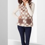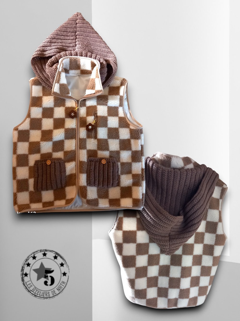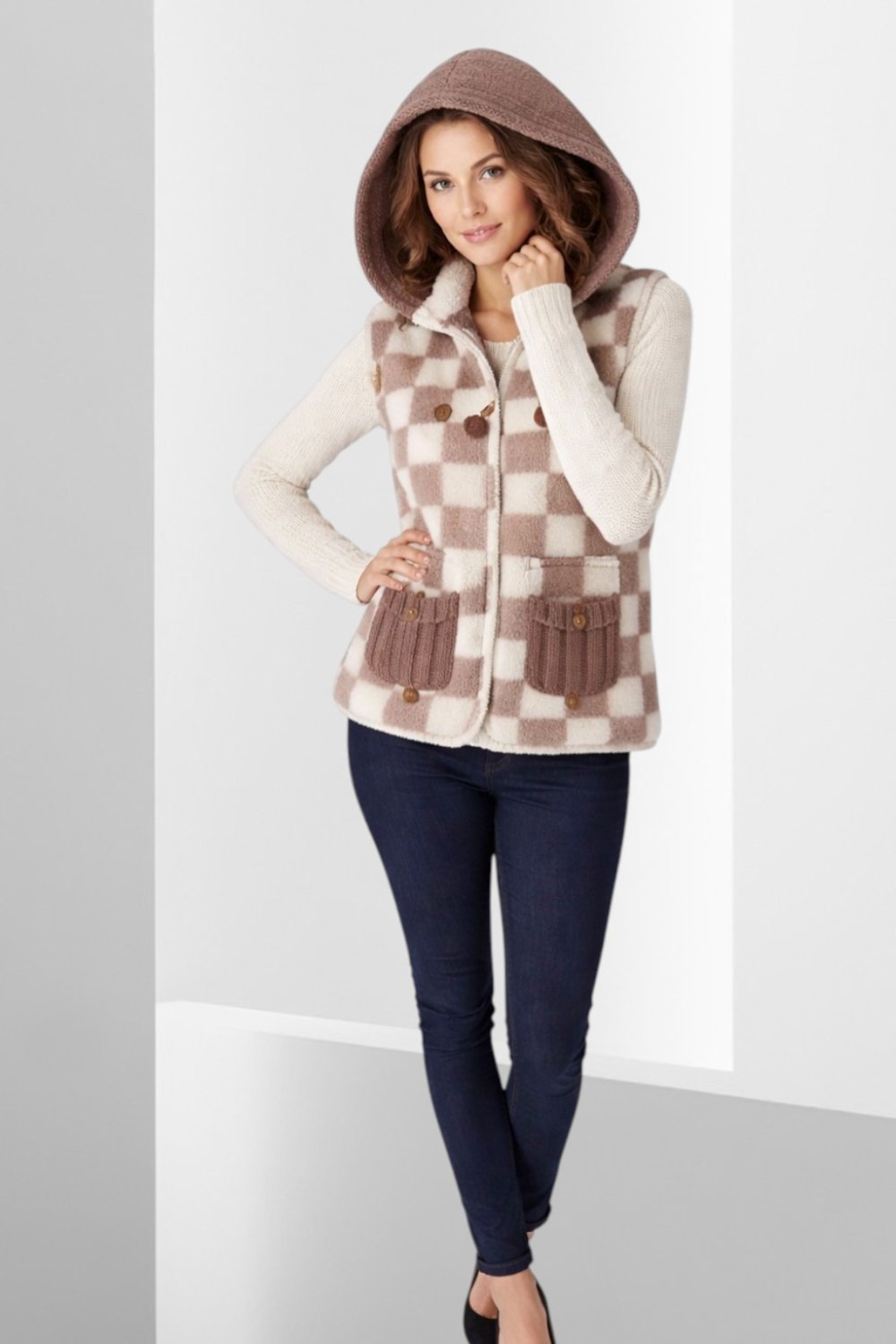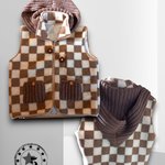 Gilet Décontracté à Carreaux Ouvert sur le Devant avec une Poche latérale et deux poches et capuche amovible faits au crochet , Gilet sans Manches pour Femme idéal pour la mis saison. Avec deux petits bijoux sur les fermetures.