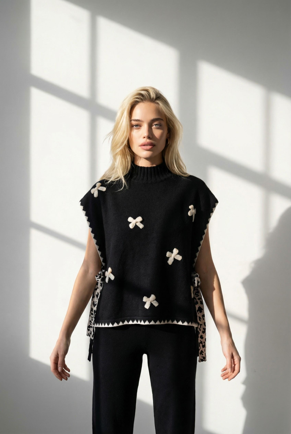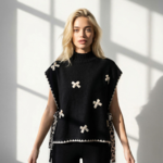 Pull chasuble col roulé sans manches, Coupe droite, agrémenté de nœuds au crochet et perles.