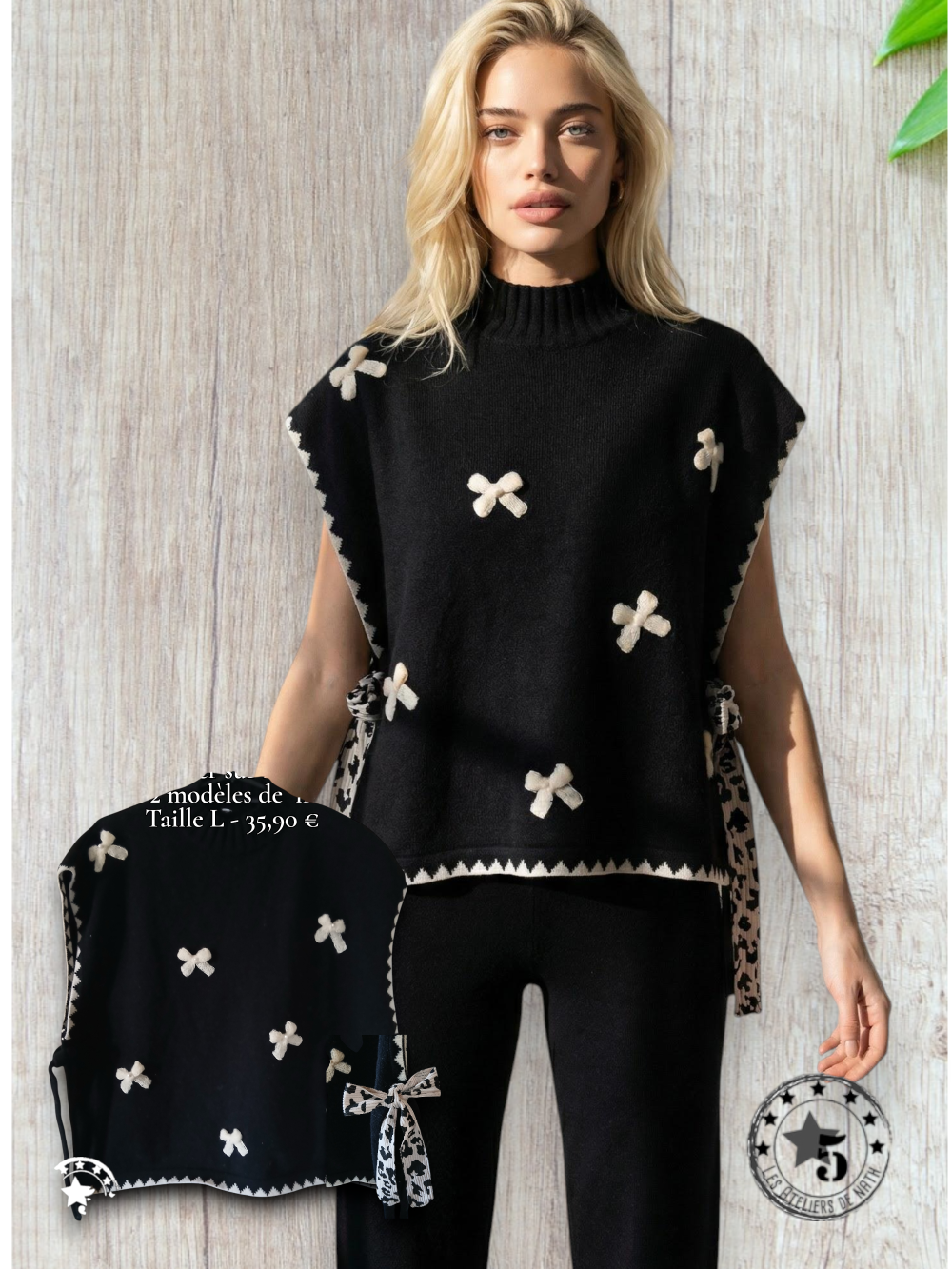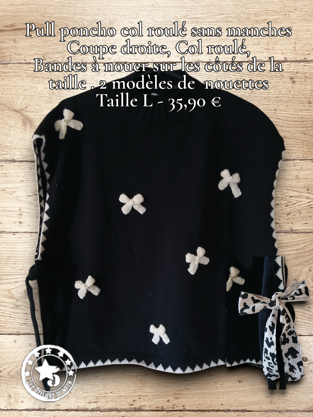 Bandes à nouer sur les côtés de la taille . 2 modèles de nouettes, une paire de noire et une paire au motif léopard noir et blanc.