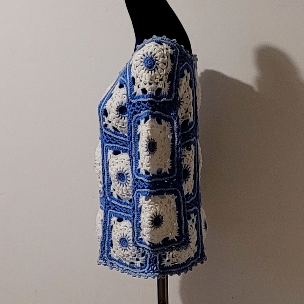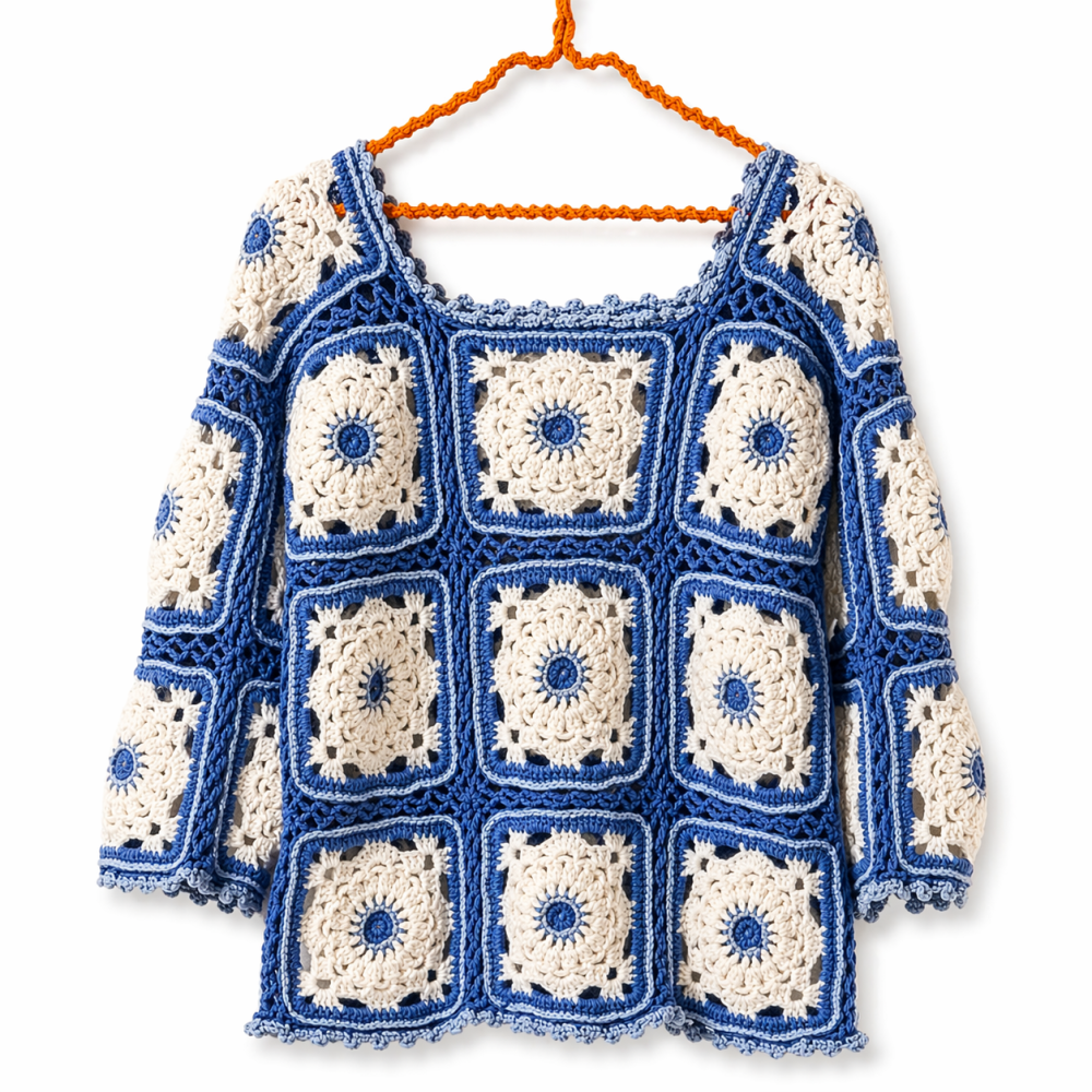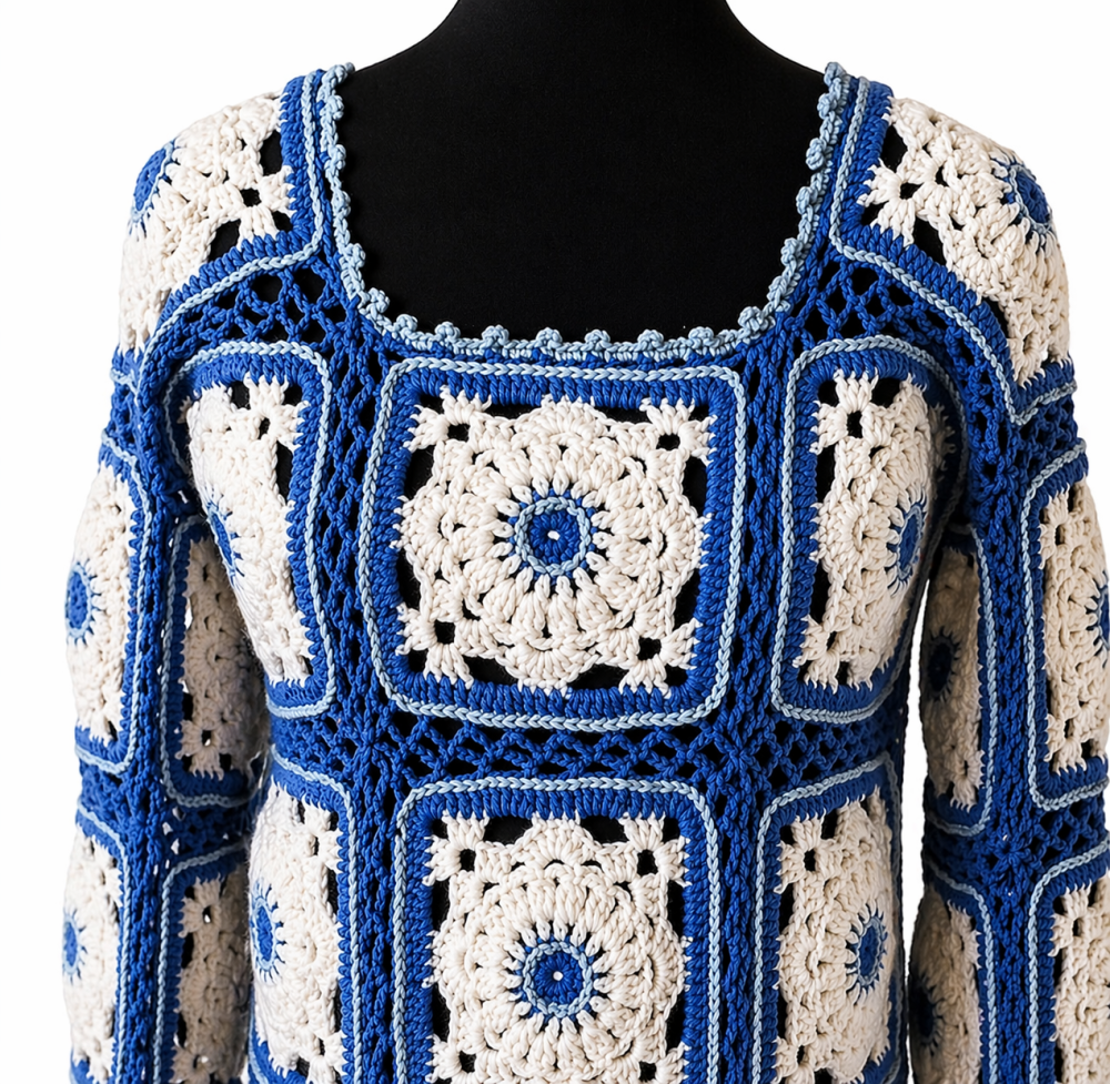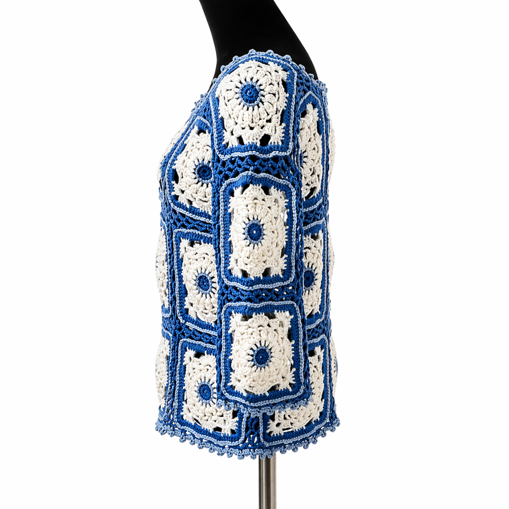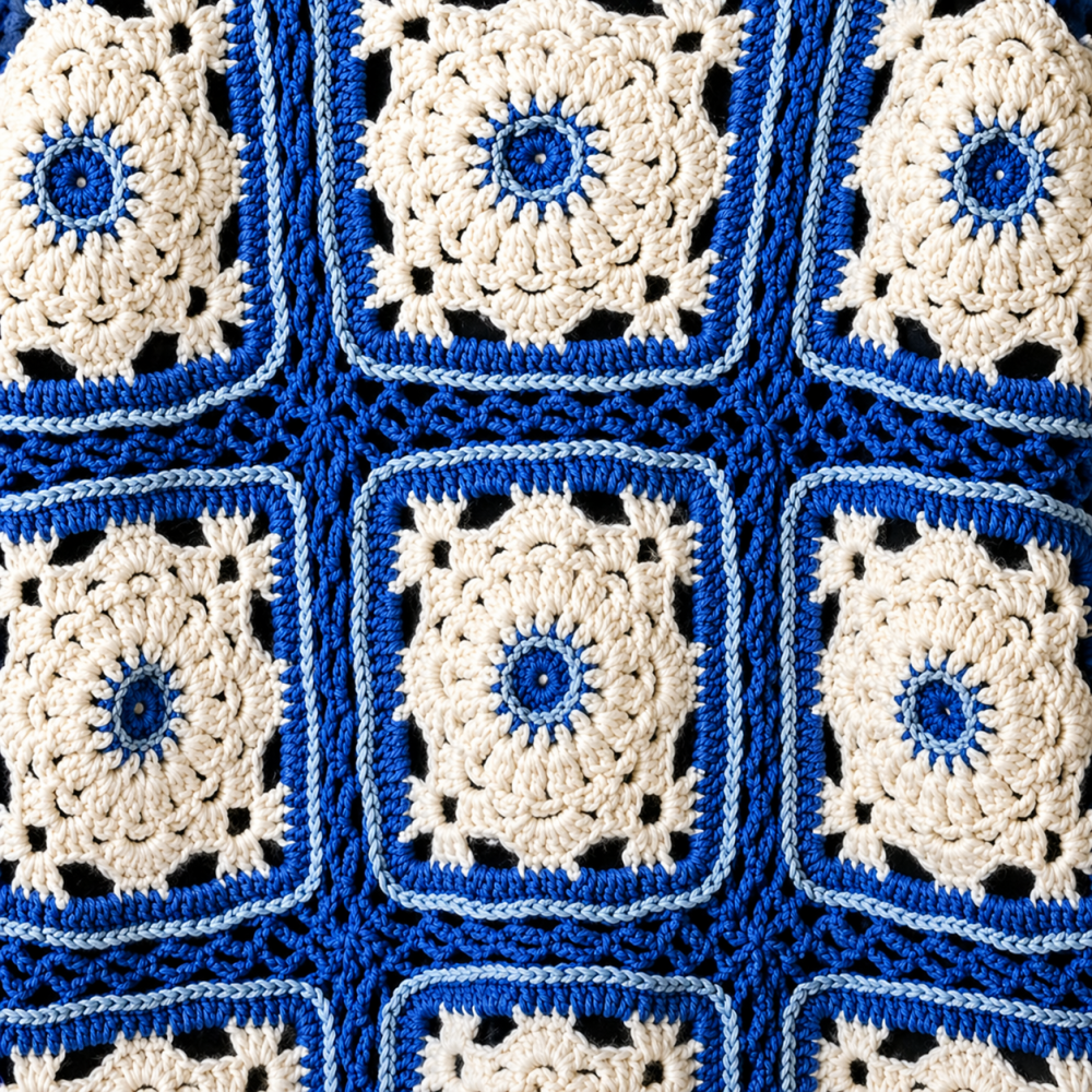 Confectionné à la main en granny en laine de haute qualité, chaque pièce est unique. Les granny sont délicatement brodés au centre et sur les contours en bleu clair, apportant une touche artisanale et raffinée à votre style.