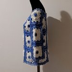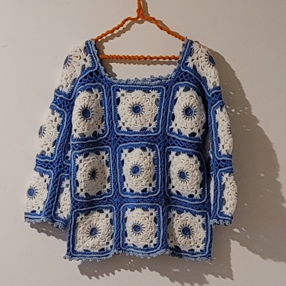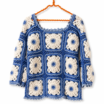 Le contour du pull est crocheté en point de picot en bleu clair, soulignant la finition soignée et la finesse du travail. Chaque détail a été pensé pour allier esthétique et durabilité, faisant de ce pull une pièce incontournable de votre garde-robe.