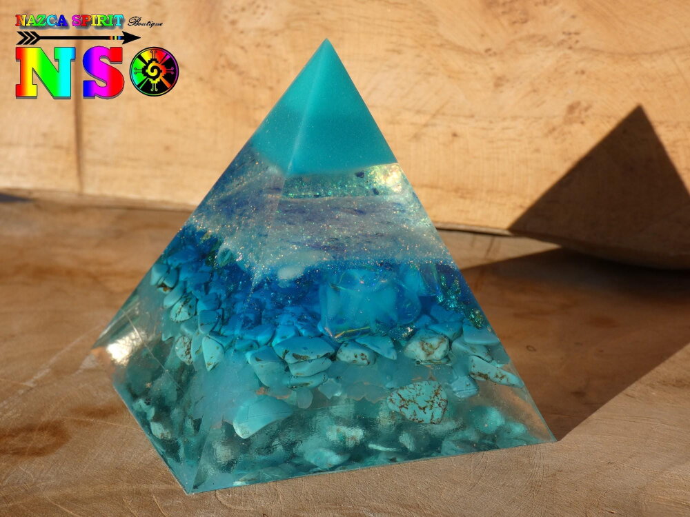 Pyramide décorative Luminescente en résine réalisée intégralement à la main. La pyramide mesure 9.5 cm de haut et sa base carrée mesure 7.5 cm cm². Durant la réalisation de cette pyramide j'ai intégré des pigments luminescents, des turquoises naturelles, des graviers luminescents, des colorants bleu turquoise et des poudres luminescentes et iridescentes.