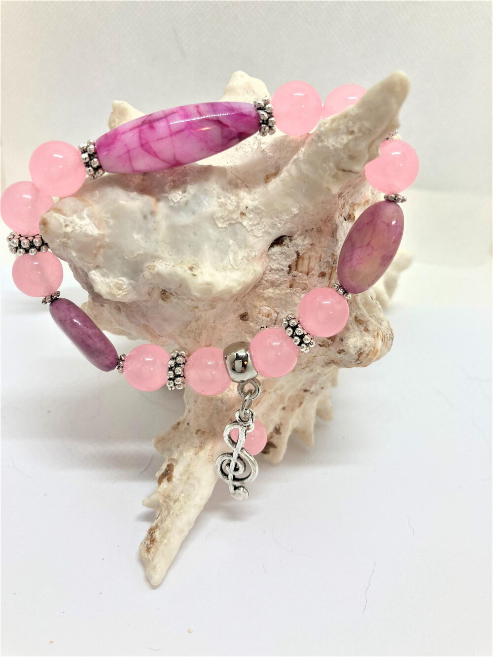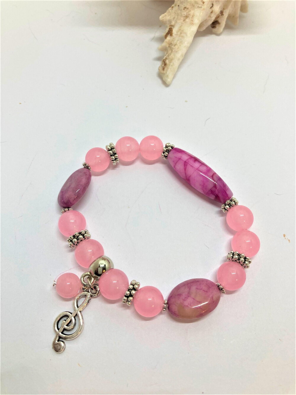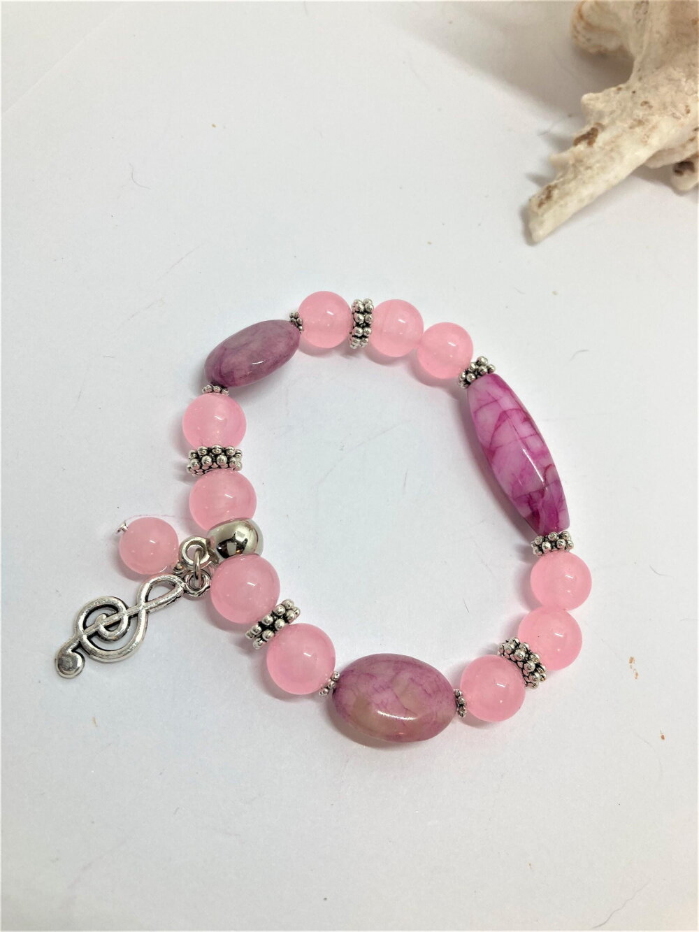 Bracelet perle ronde en quartz rose 10mm, 2 perles ovales plates et une perle ovale longue en agate rose. Pierre semi-précieuse avec une breloque clé de sol argentée et une Perle en quartz rose de 8mm.