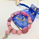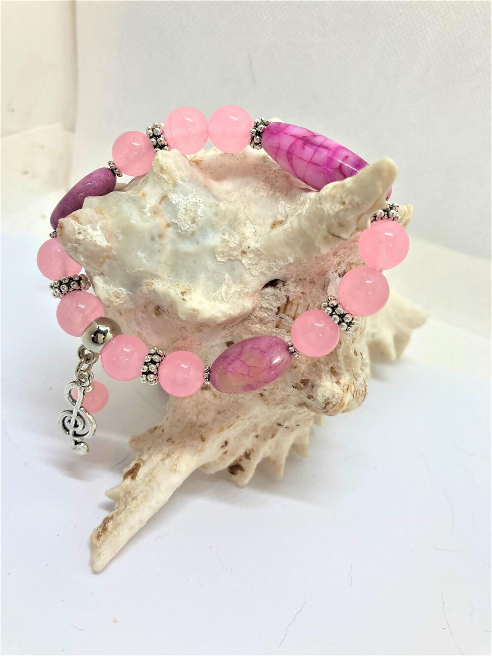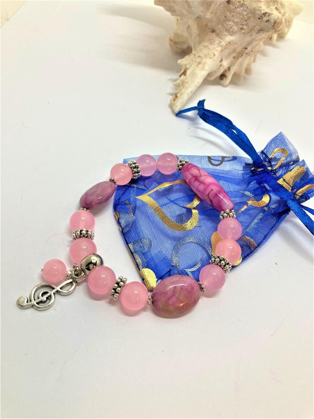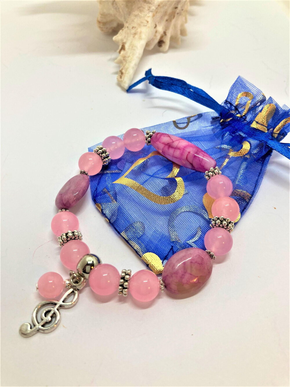 Bracelet perle ronde en quartz rose 10mm, 2 perles ovales plates et une perle ovale longue en agate rose. Pierre semi-précieuse avec une breloque clé de sol argentée et une Perle en quartz rose de 8mm.