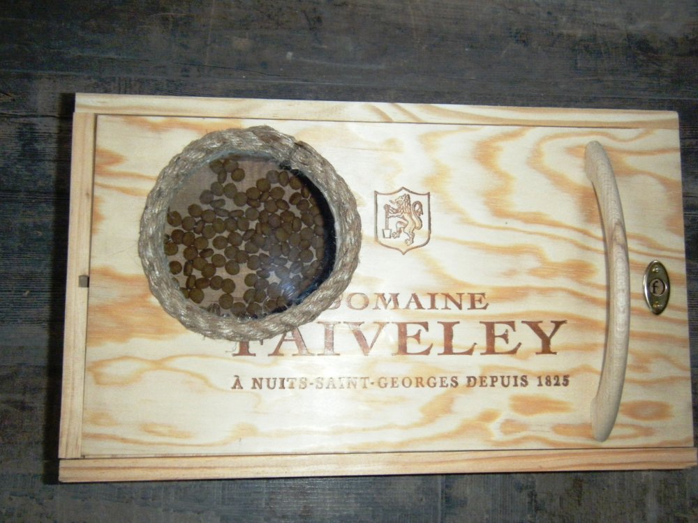 Boite à vin reconditionné en boite à croquettes pour animaux, avec poignée et vernis alimentaire,