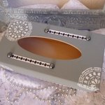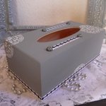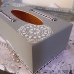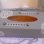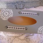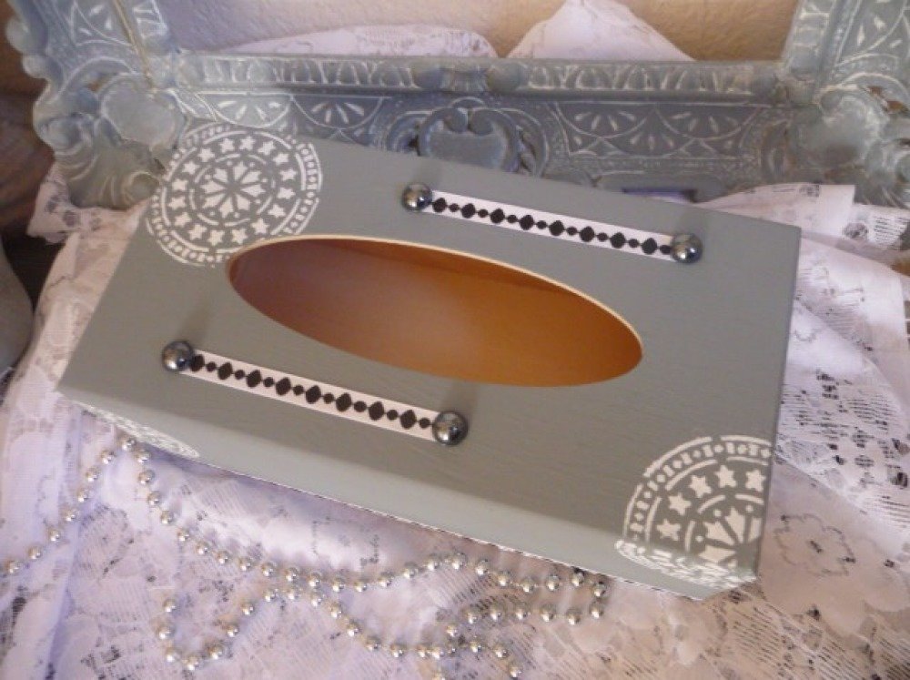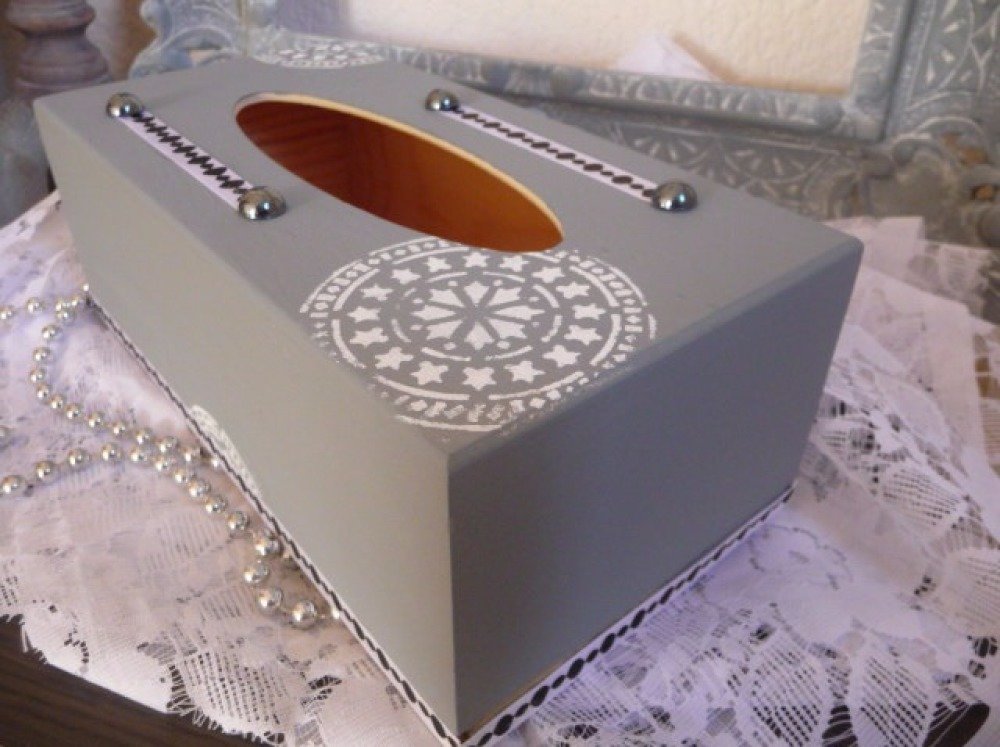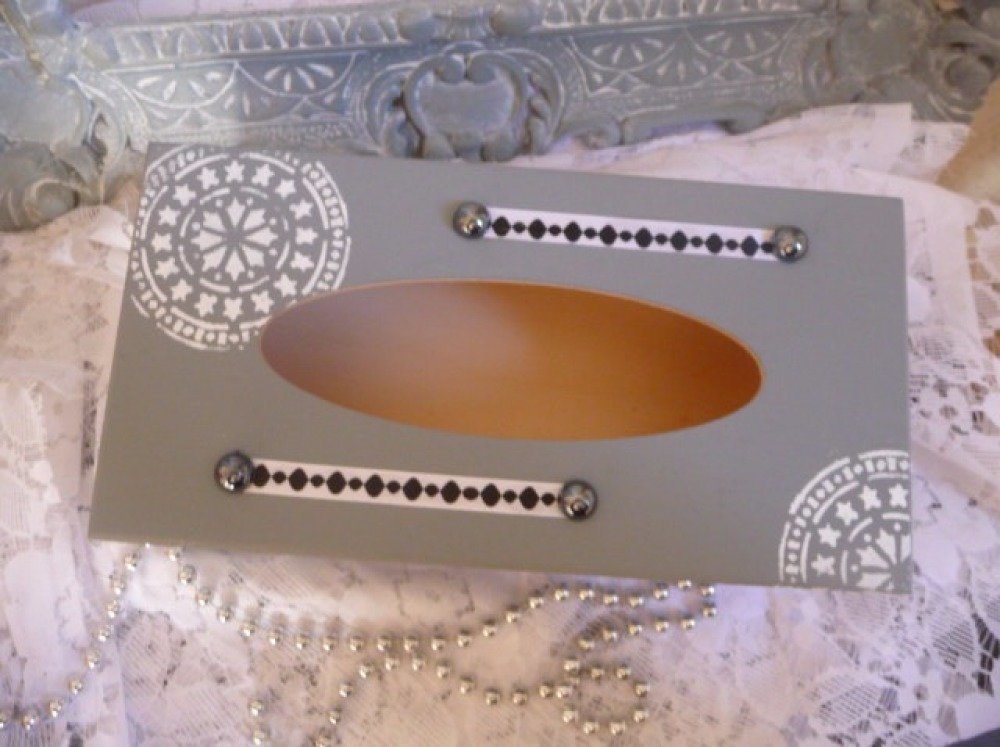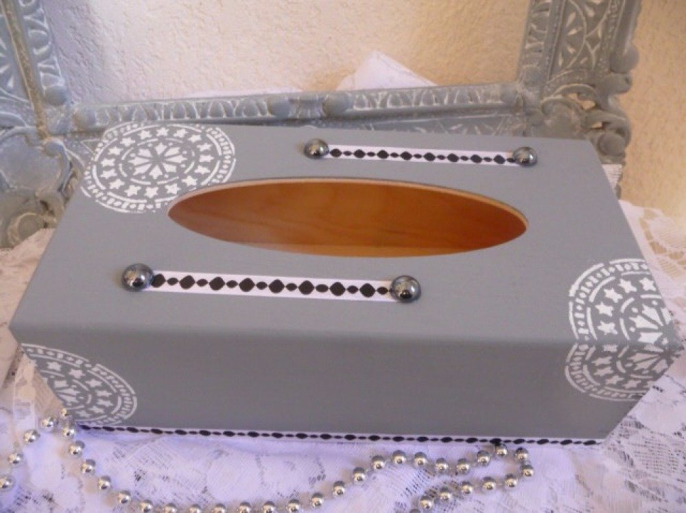 Boite à mouchoirs en bois peinte gris gustavien décorée de motifs mandale au pochoir, ruban satin,demi perles noires nacrées
