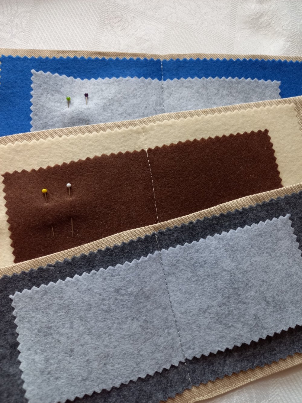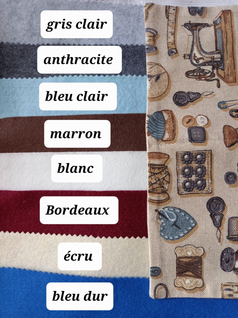 Vous avez la possibilité de choisir les 2 couleurs de la feutrine parmi celles que je vous propose, il y en a 8 + du vert foncé (non photographié).