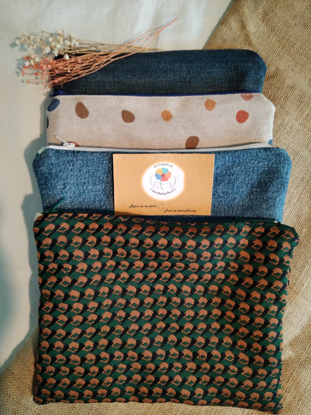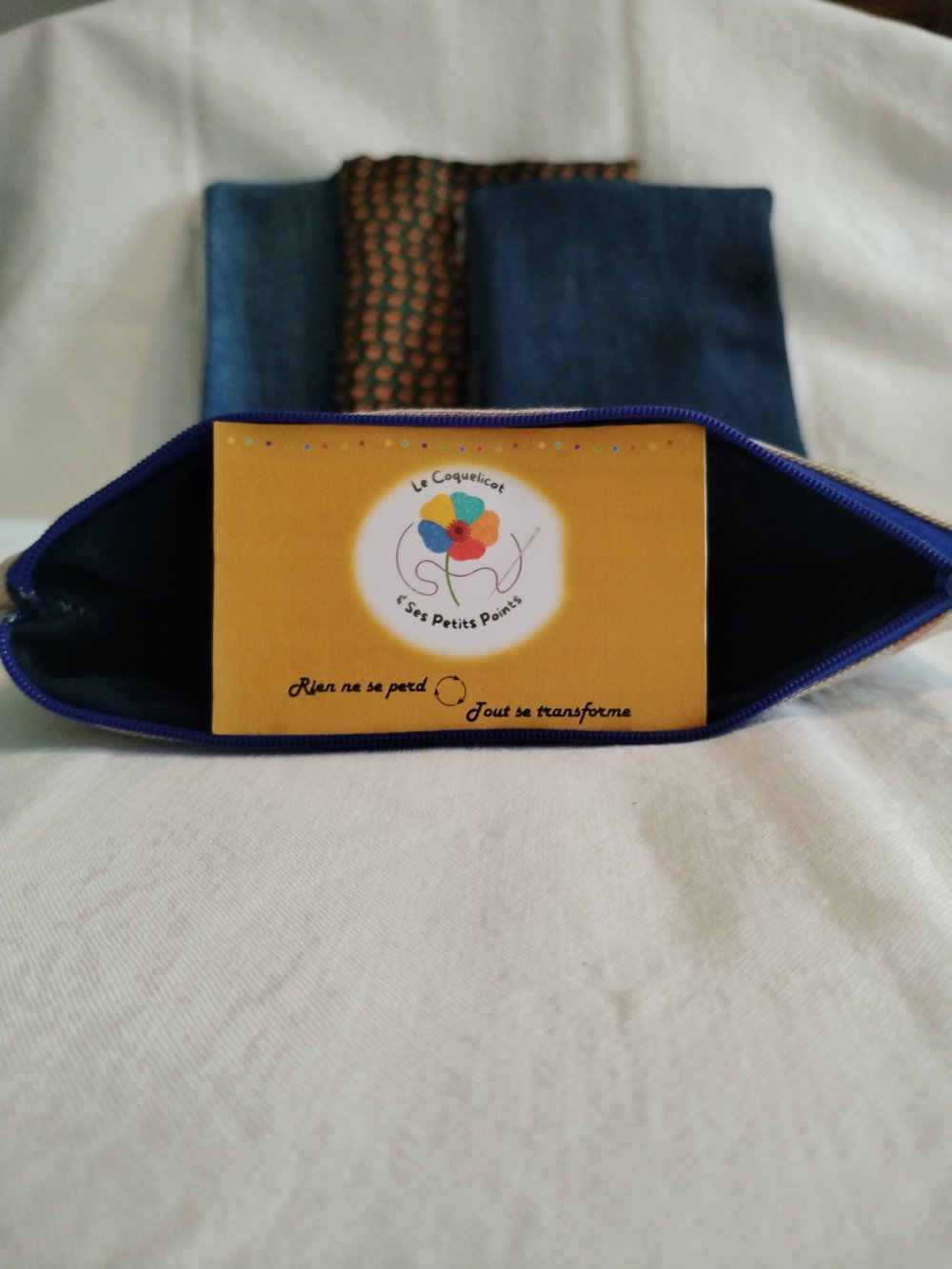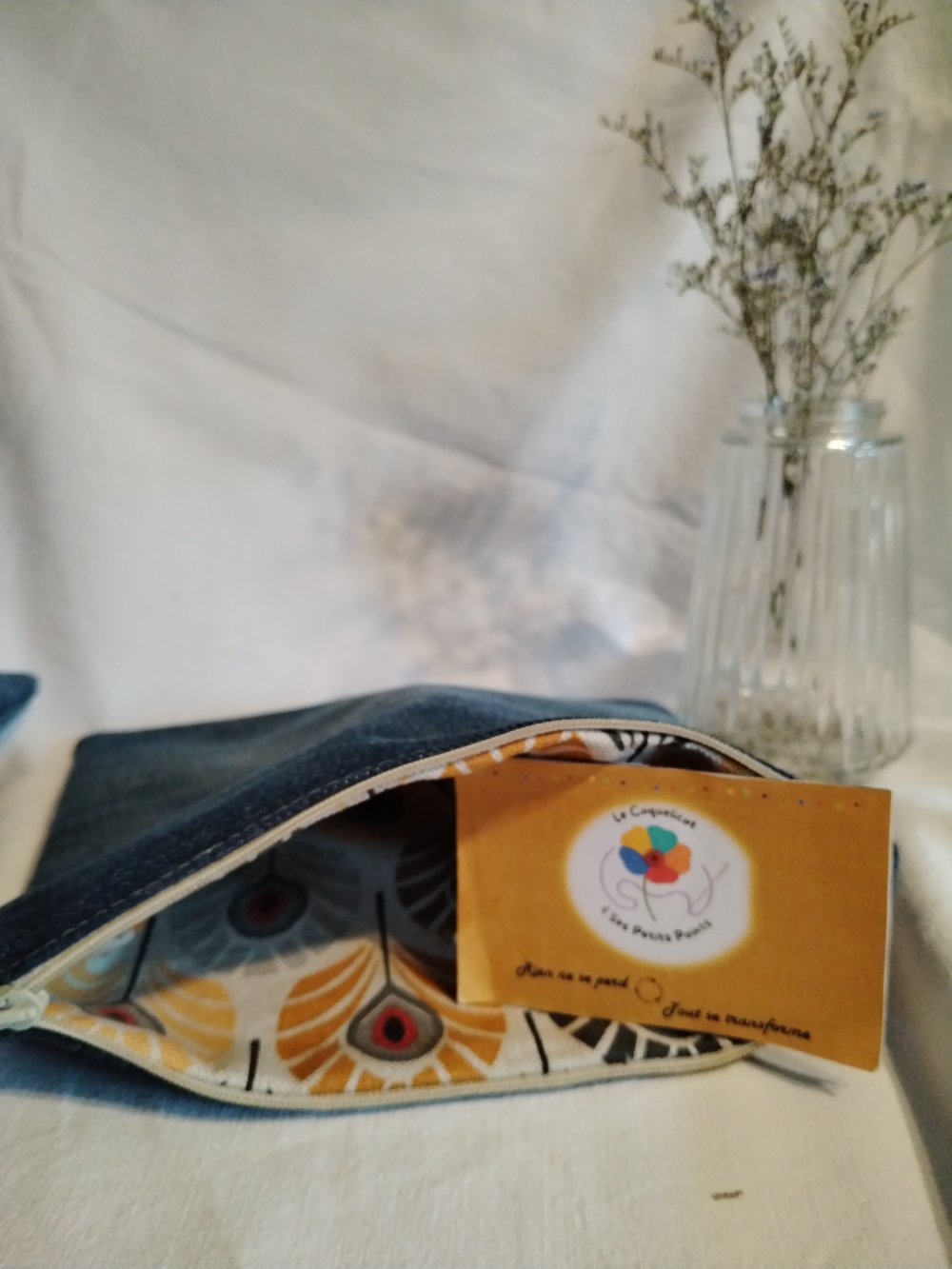Que vous partiez en week-end, au travail ou simplement pour organiser votre quotidien, cette trousse à tout faire est l’alliée idéale. Confectionnée à partir de tissus de seconde main, elle accueille facilement maquillage, accessoires, crayons ou petits objets du quotidien. Pratique et pleine de charme, elle apporte une touche colorée et responsable à votre organisation.
