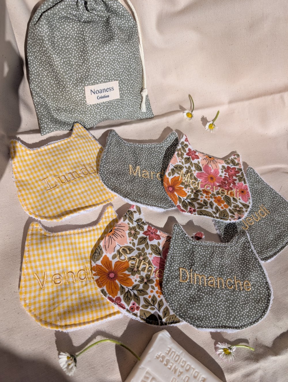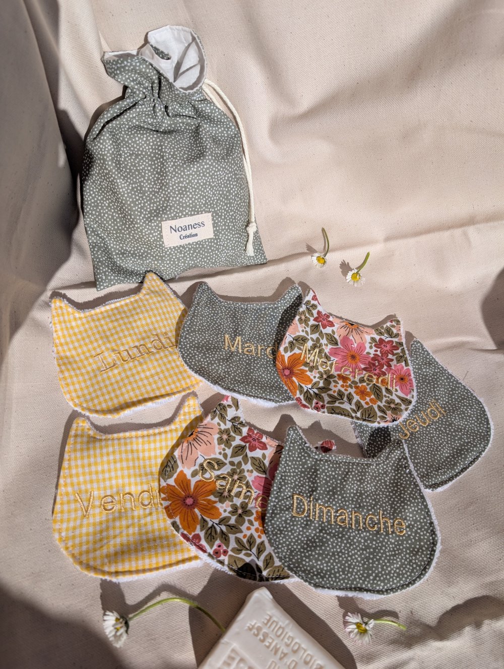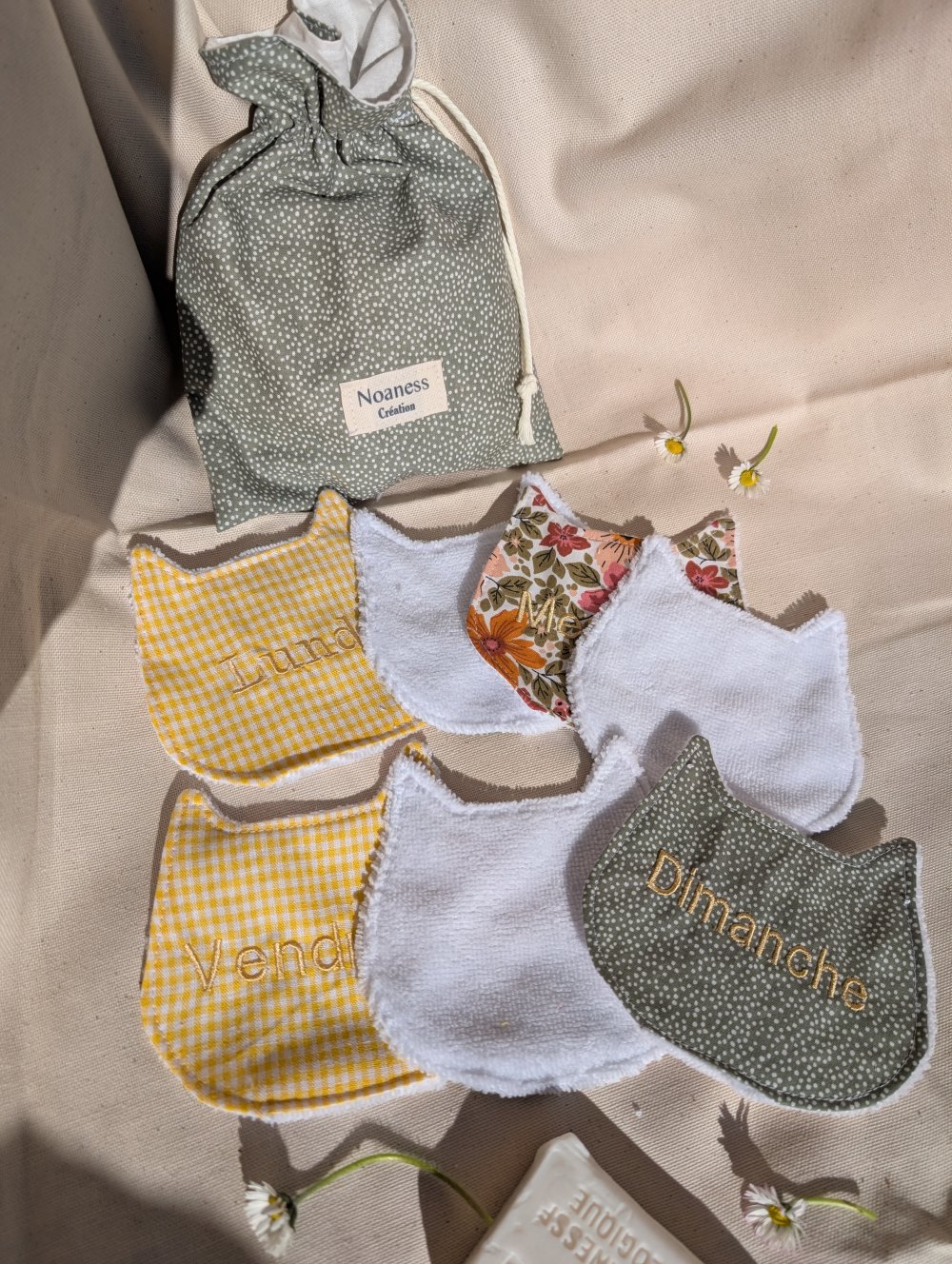 Adoptez une routine beauté simple, douce et zéro déchet avec ce lot de 7 lingettes lavables en éponge de bambou, brodées avec chaque jour de la semaine.
