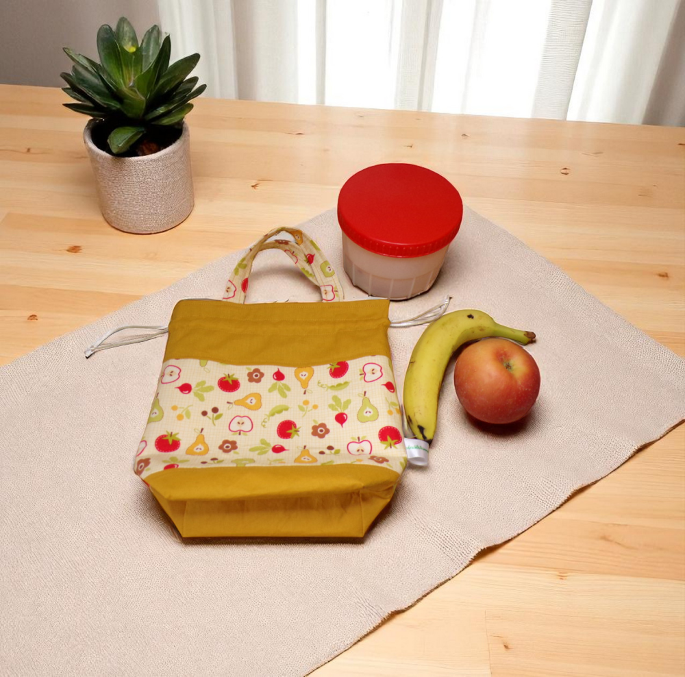 lunch bag, sac déjeuner, sac repas lavable, modèle fruits / moutarde