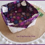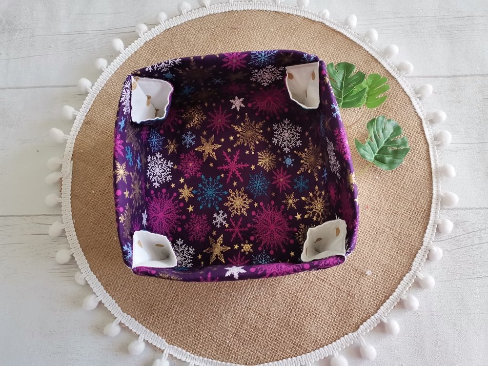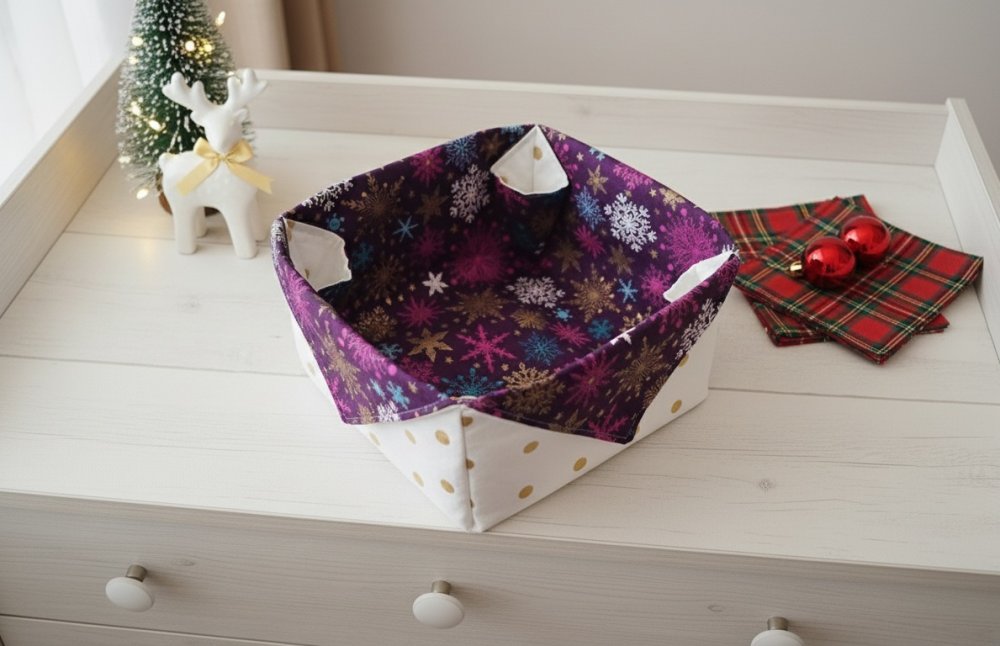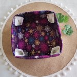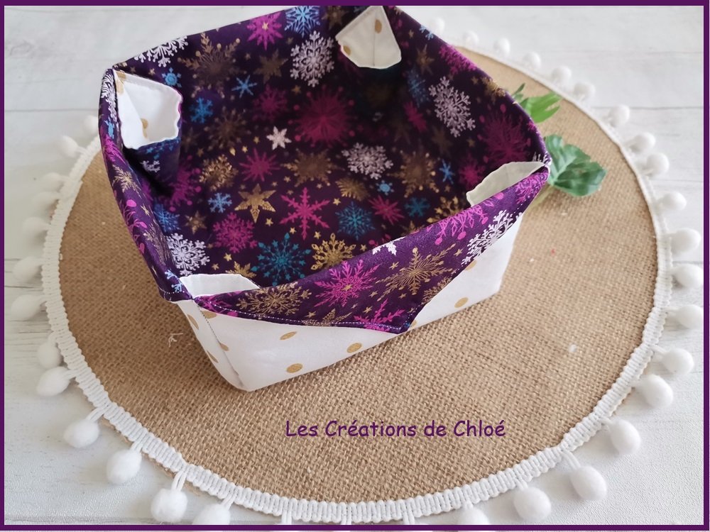 Réalisé en tissu certifié Oeko-Tex de couleur violet motifs flocons et beige motifs pois dorés
