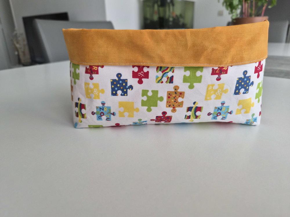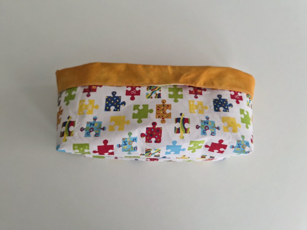 Panier en tissu réversible - motifs puzzles et doublure moutarde