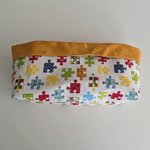 Deux tissus 100% coton : extérieur à motifs puzzles multicolores, intérieur en coton uni moutarde.
