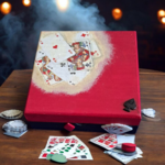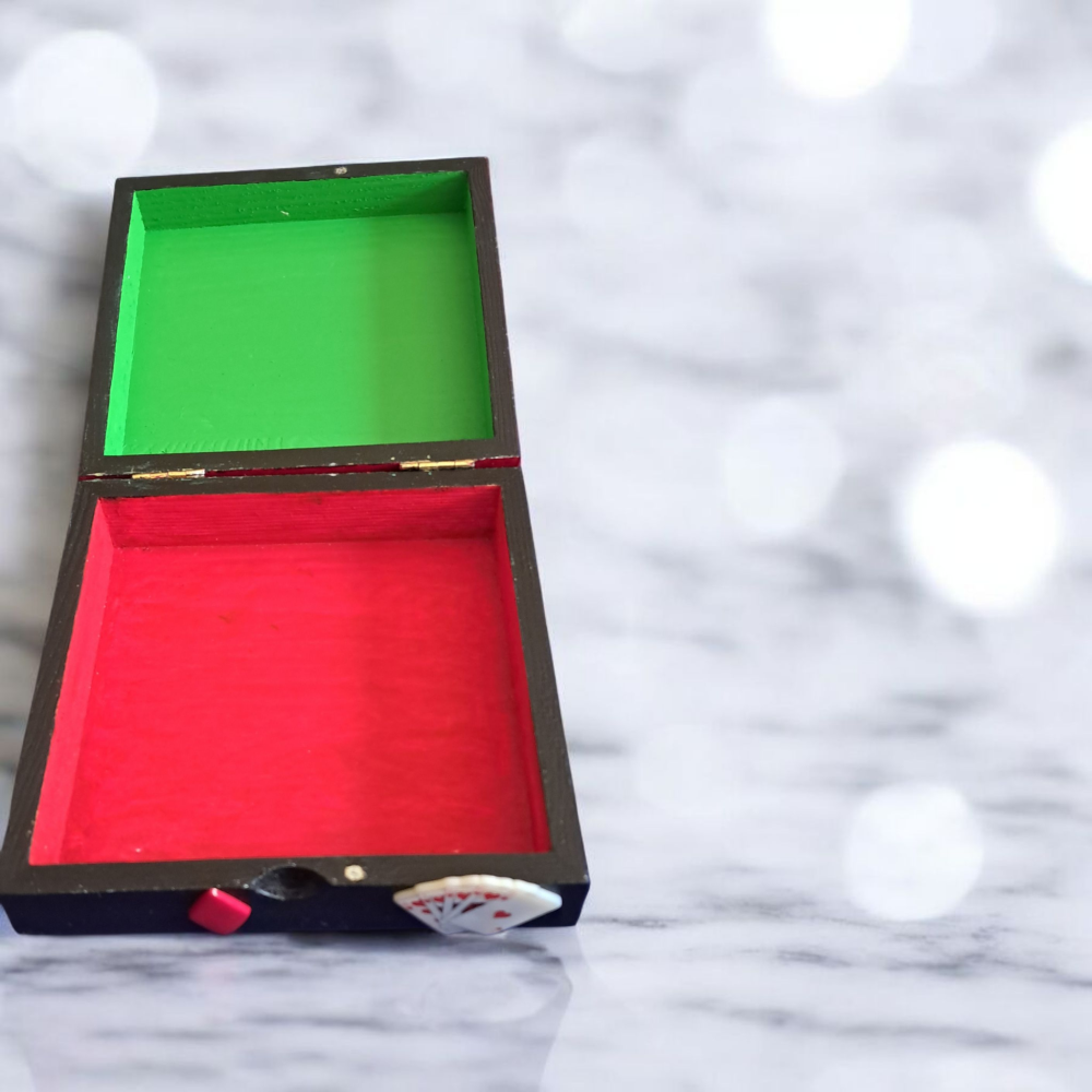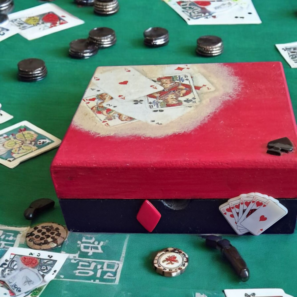 Je vous propose une charmante boîte en bois, entièrement customisée dans mon atelier. Peinte dans des tons rouge, vert et noir, elle est ornée de motifs collés représentant des cartes à jouer, lui donnant un style unique.