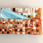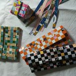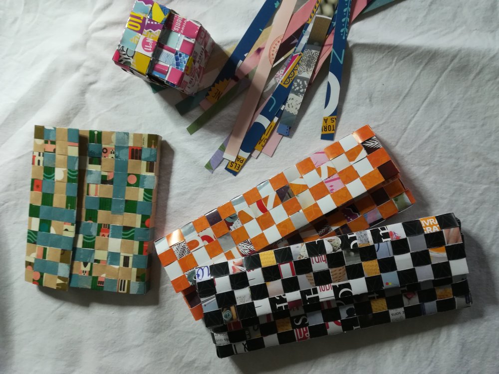 Au lieu de jeter les magazines, nous avons coupé des bandes de papier dans les pages les plus colorées et nous avons réalisé ces pochettes. Le tissage est effectué sans colle et le tout est recouvert de vernis pour solidifier le tout.