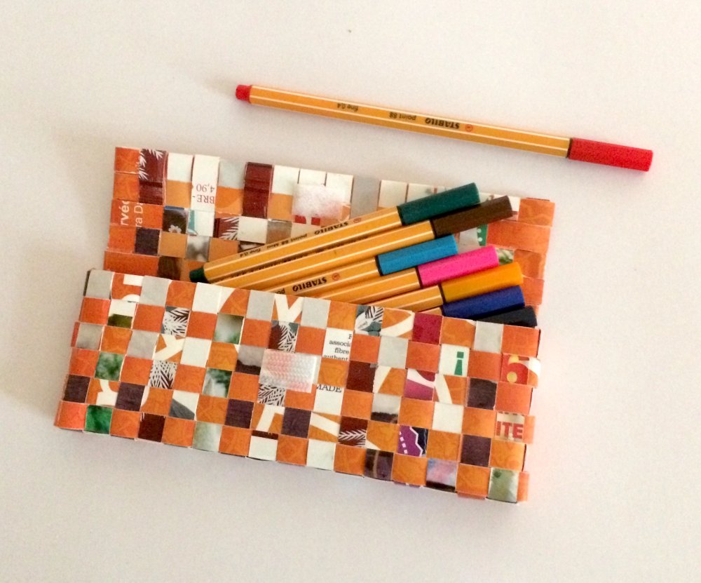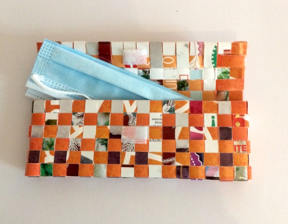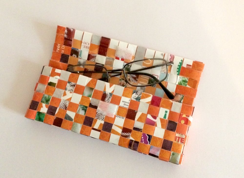 Tissage de papier en récupération magazines, étui à lunettes ou à stylos, étui masque