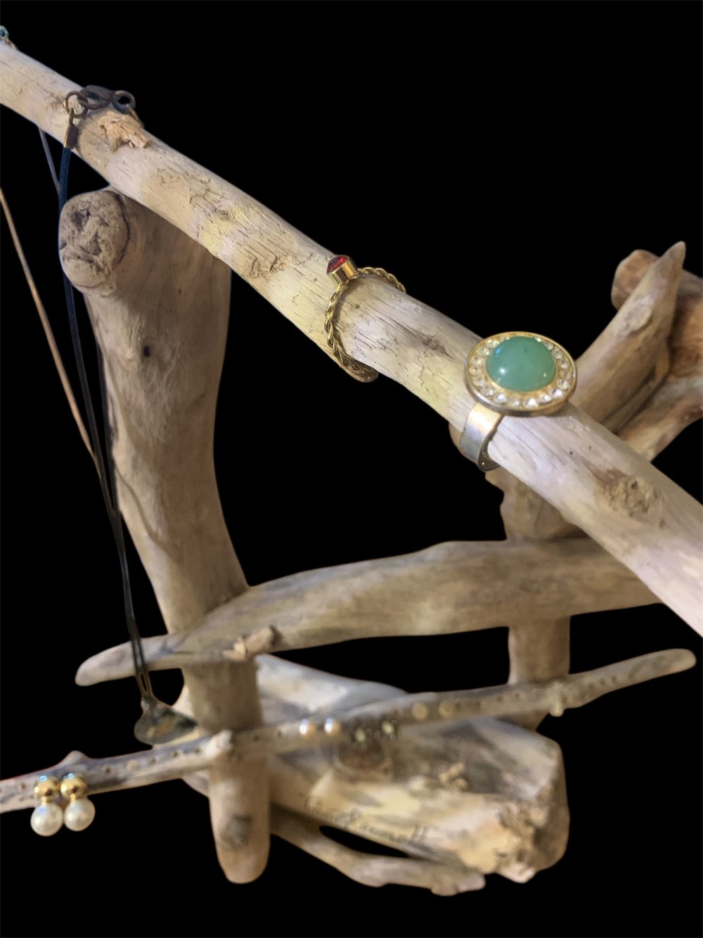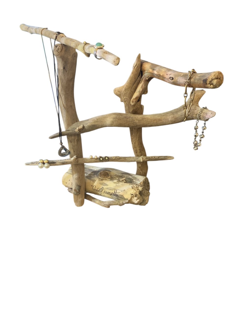 Porte bijoux en bois flotté. Porte bijoux, 0 déchet. Porte bijoux, écolo. Porte bijoux idéal pour ranger colliers, bracelets et boucles d'oreilles. Décoration pour vitrine de bijouterie. Rangement en bois flotté pour suspendre les bijoux. Idée cadeau pour toute occasion. Création Made in France, en bois flotté. Fabrication artisanale. Hauteur 39 cm. 4 bois dont 1 avec trous pour ranger les boucles d'oreille.
