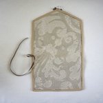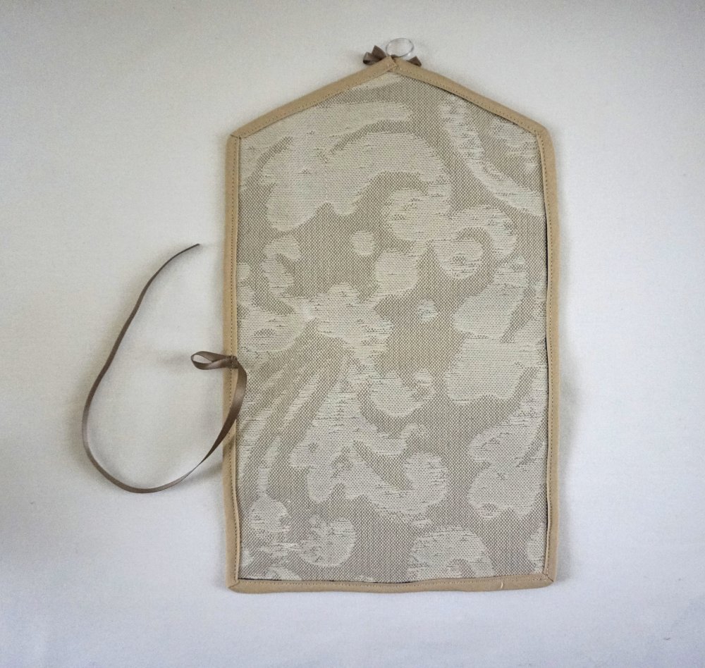 Porte bijoux en tissus gris et beige damassé et bord beige. Très pratique, vous pouvez y accrocher vos boucles d'oreilles, broches, bracelets et colliers.