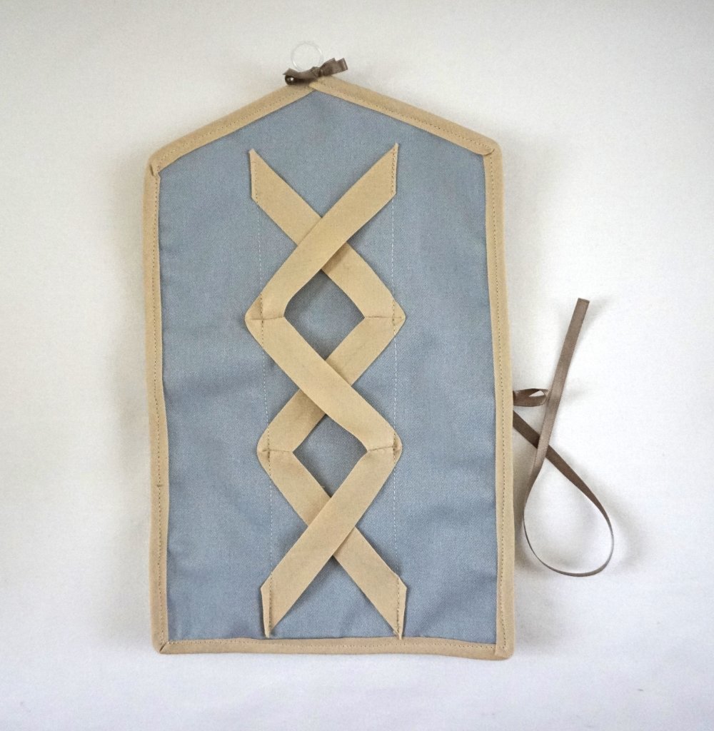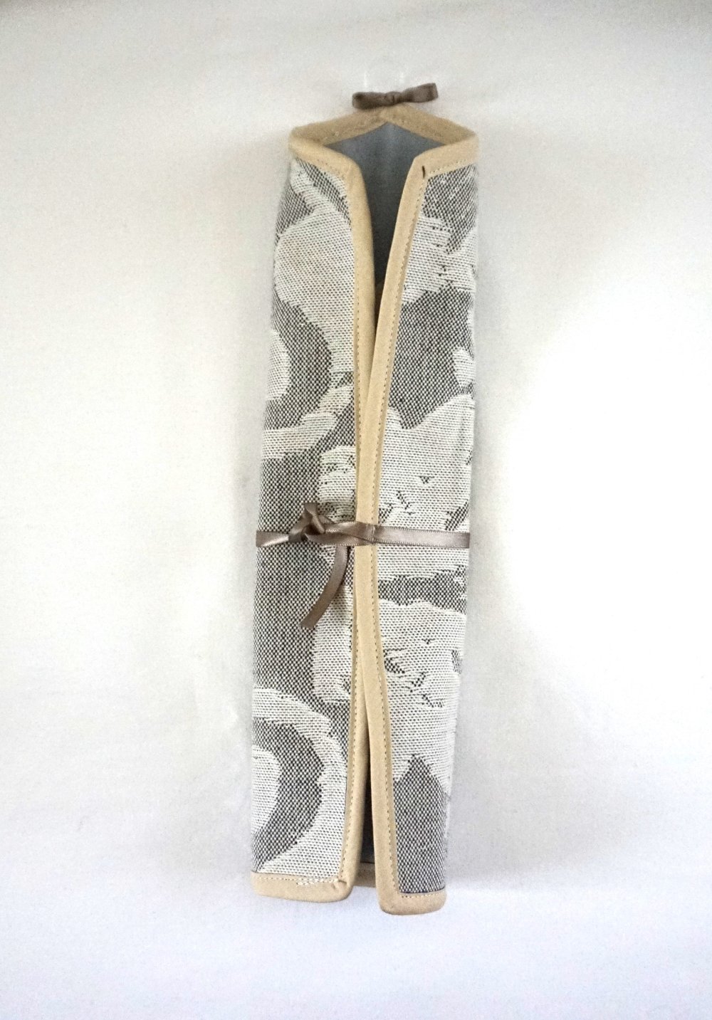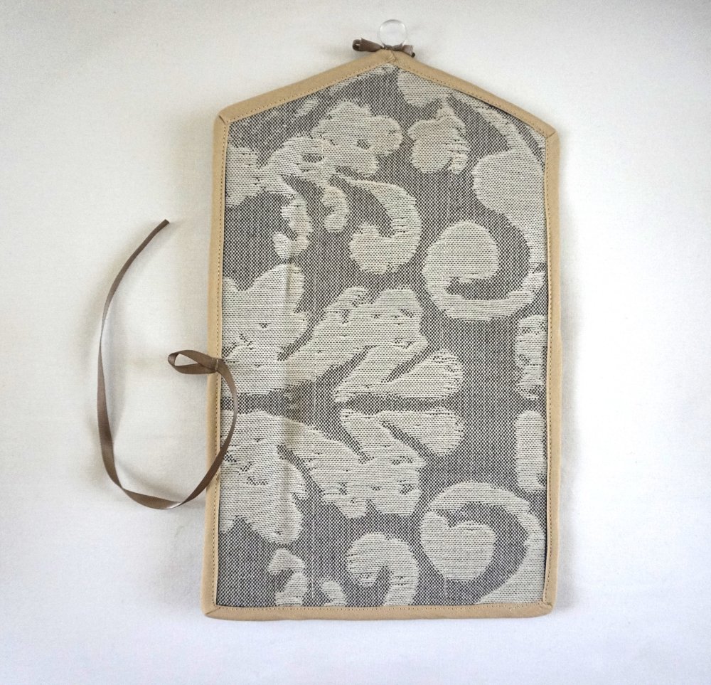 Porte bijoux en tissus gris et gris beige et bord beige. Très pratique, vous pouvez y accrocher vos boucles d'oreilles, broches, bracelets et colliers.