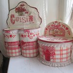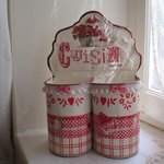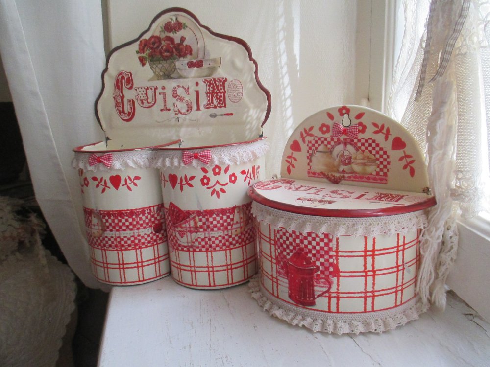 Décors : Patinée lin, enseigne ancienne " Cuisine " guipures anciennes, nœuds vichy rouge.